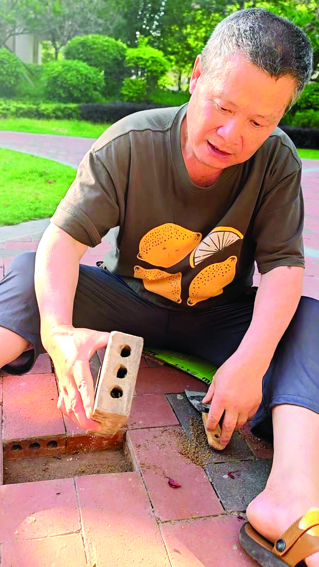 記者當(dāng)天看到,小區(qū)人行道一塊塊松動(dòng)磚塊在劉叔勤勞的雙手修補(bǔ)下變牢固了。不知不覺劉叔已修補(bǔ)了1個(gè)多小時(shí)磚塊,汗水浸濕了他的衣衫,他手上皮膚也因勞作變得通紅,但他臉上時(shí)不時(shí)露出笑容。