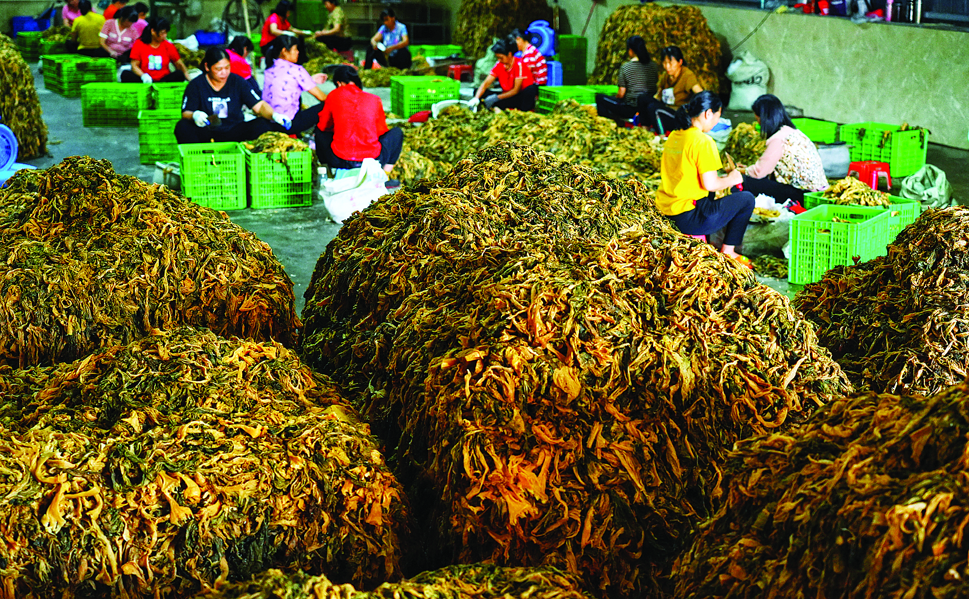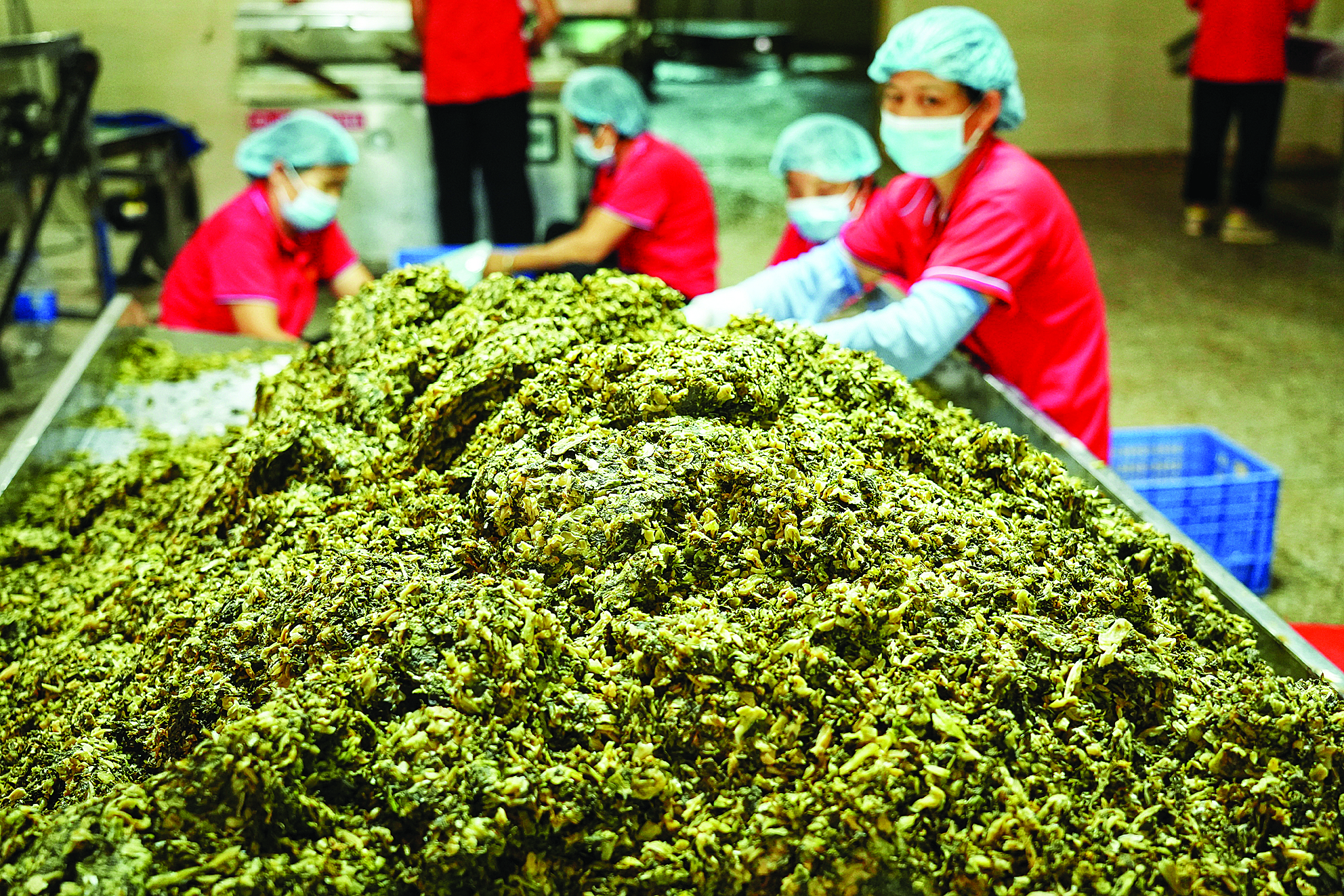 廣東譚喜農(nóng)業(yè)科技有限公司生產(chǎn)車(chē)間內(nèi),工人在加工梅菜。