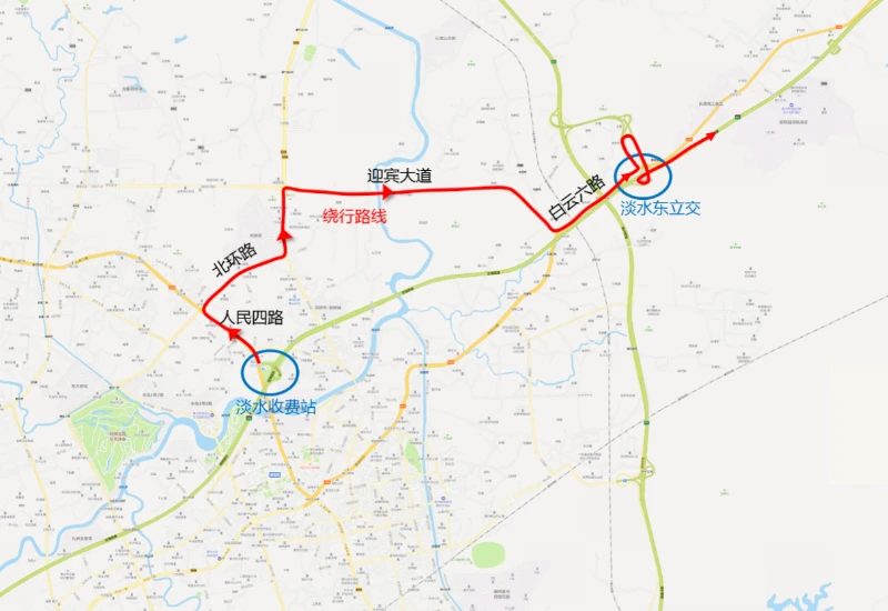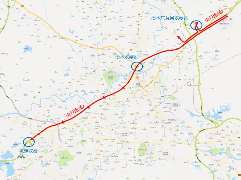 G15沈海高速淡水收費(fèi)站相關(guān)匝道臨時(shí)封閉期間繞行示意圖。
