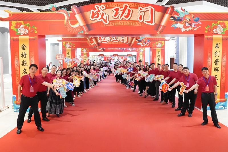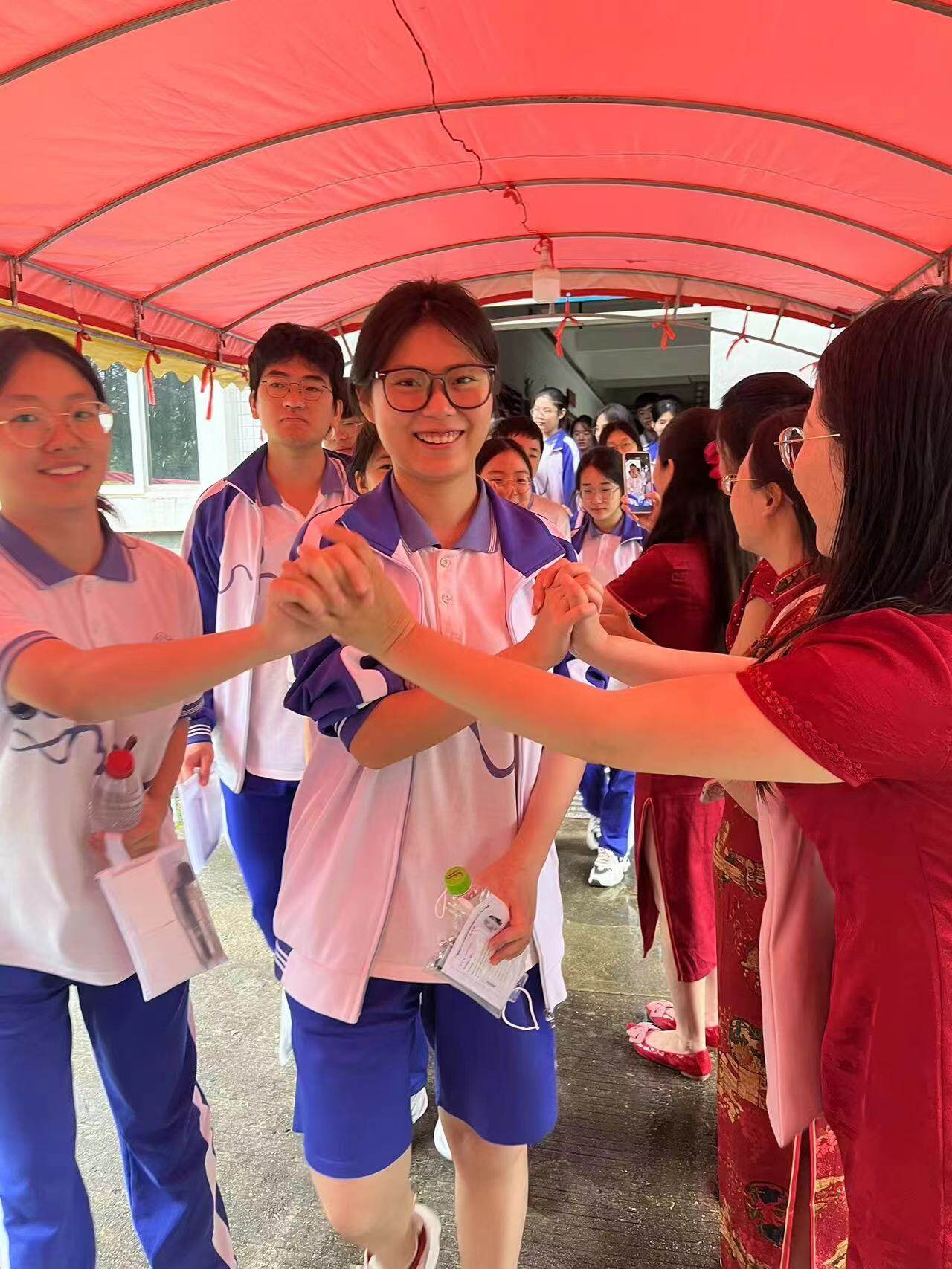 在惠州中學(xué),校領(lǐng)導(dǎo)帶領(lǐng)高三年級全體教師站在紅毯兩旁為2024屆考生送上祝福。身穿紅色上衣的老師們,和考生一一擊掌,目送他們走向“成功門”。