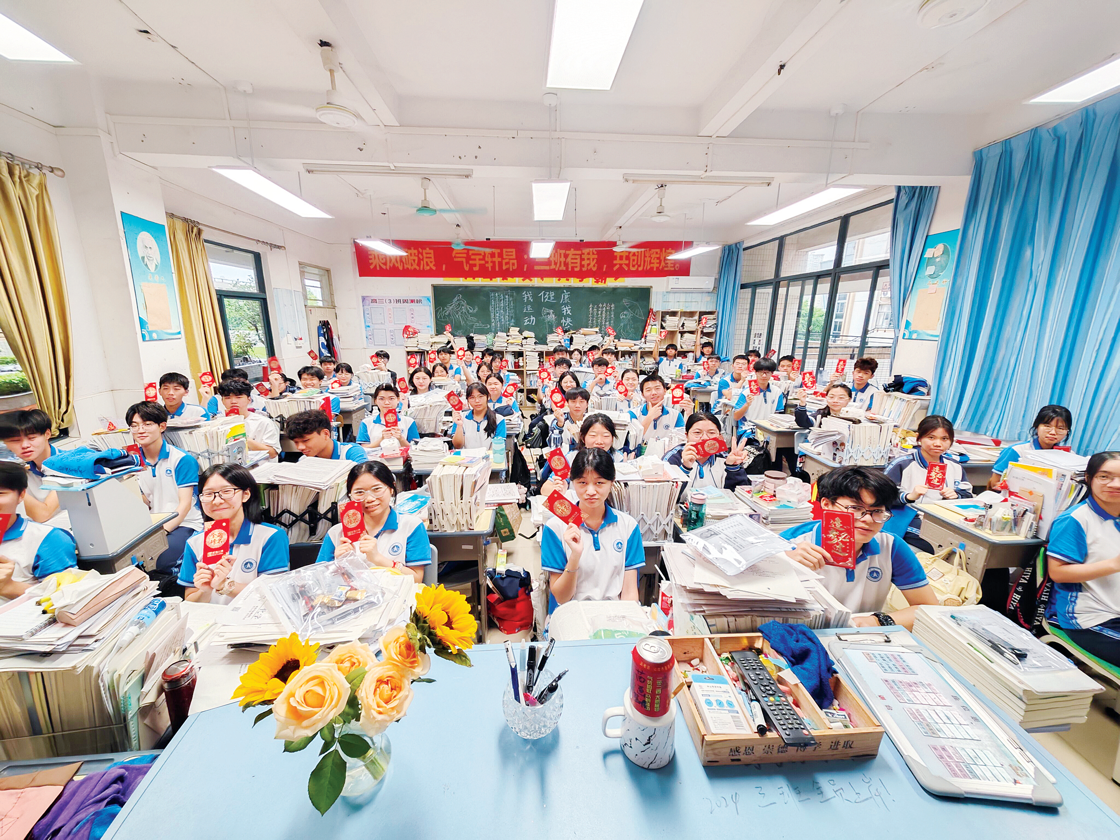 惠州市華羅庚中學(xué)考點,考前老師為考生發(fā)“祝福紅包”,孩子們激情滿滿喊出加油口號!惠州日報記者范文燕 通訊員何貝雅 攝