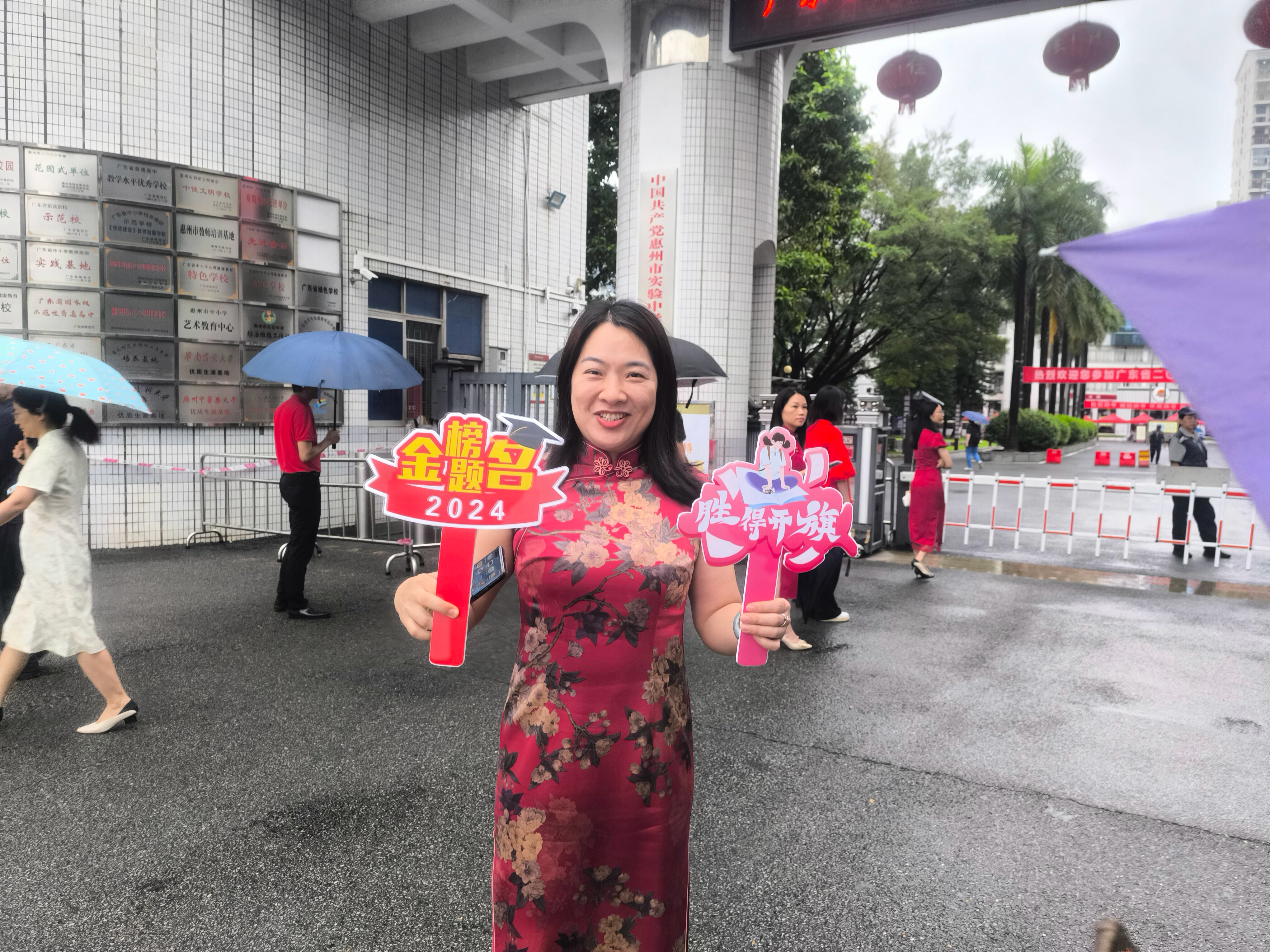 家長穿旗袍送考,寓意“旗開得勝”。 惠州日報記者記者范文燕 賴華海 攝