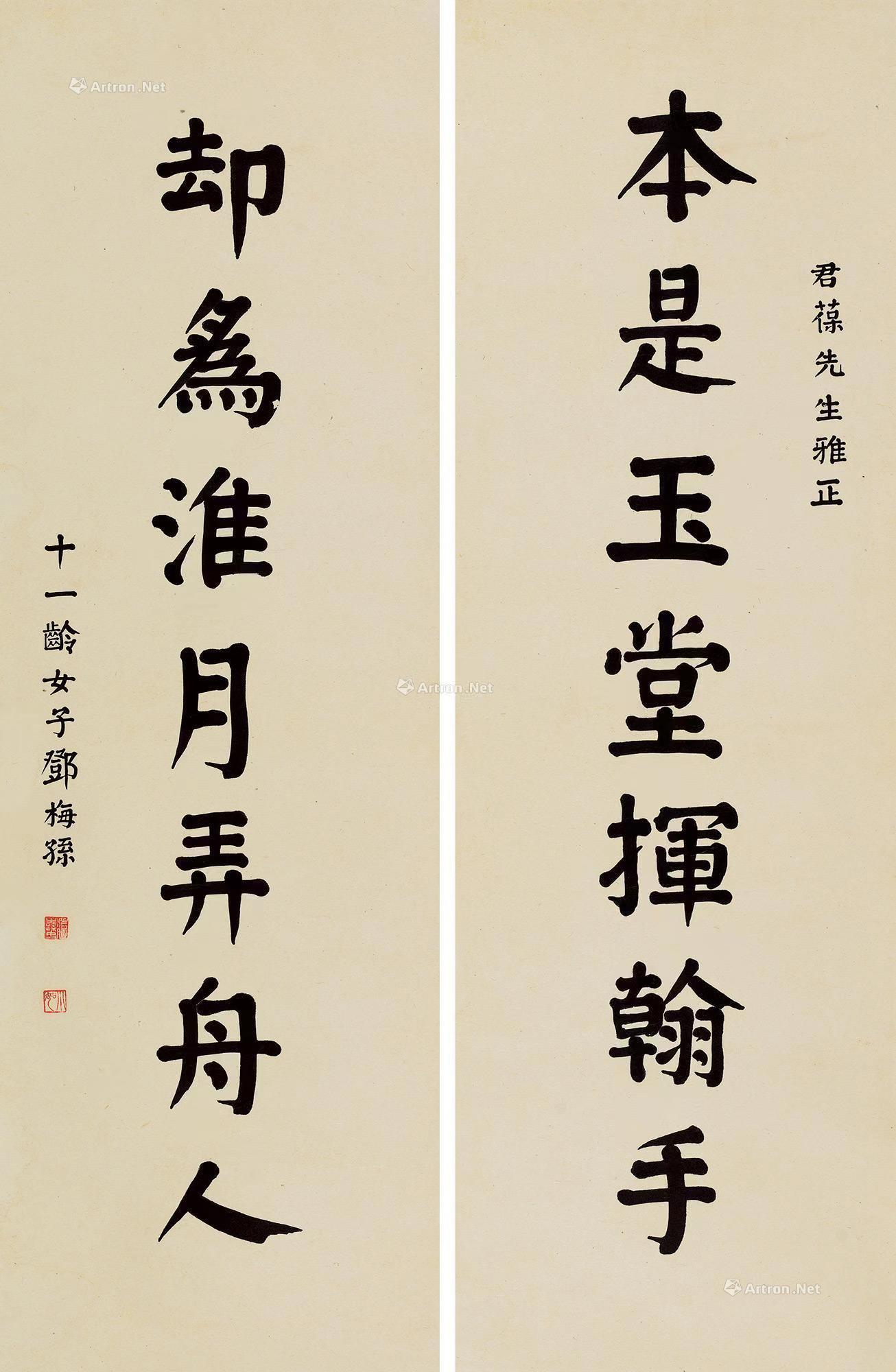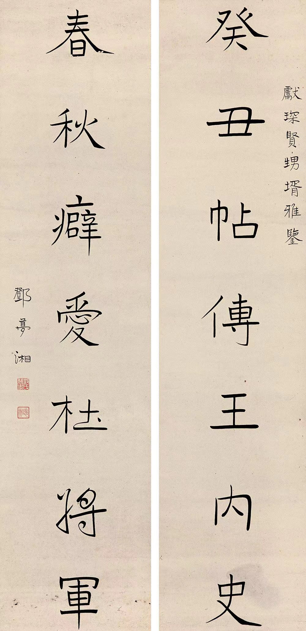 民國初年,邑人裘集裳結(jié)簫社于水東白鶴峰,向嶺南文化名流征詩,夢湘自書二絕句以贈,清越之音傳遞了詩人面對亂世的深沉意緒。詩云:“清宵不是可憐宵,白鶴峰頭勝侶邀。譜出幽人幽景好,滿江明月一聲簫!庇衷疲骸皝y世徒聞治世音,沉沉堪痛劫灰深。可能念四龍吟管,吹復(fù)群氓太古心!庇^此條幅,頗能見承修筆意和法度,論書風(fēng),可以說她是“多似為而翁”的。但又有自己的風(fēng)格特點,如折拗彎鉤處便每每化方為圓,瘦而實腴,比之其父,似乎是少了幾分剛介與執(zhí)著,而多情才女的秀逸風(fēng)華卻也因此更加凸顯,別具一種剛?cè)岵。廣東省博物館藏有鄧夢湘楷書七言聯(lián):“淺碧新瓷烹玉茗,硬黃佳帖寫銀鉤!逼滹L(fēng)貌意趣亦與之頗相類似。
