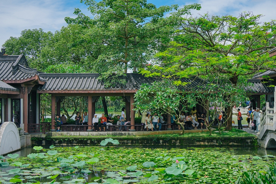 五、六月的惠州,雨水頻密?删驮诙宋缂压(jié)當(dāng)日,太陽(yáng)又切換了回來(lái)。盡管還不是豐渚園荷塘里最絢爛的時(shí)景,卻也讓湖畔多了不少前來(lái)賞花打卡的游客。