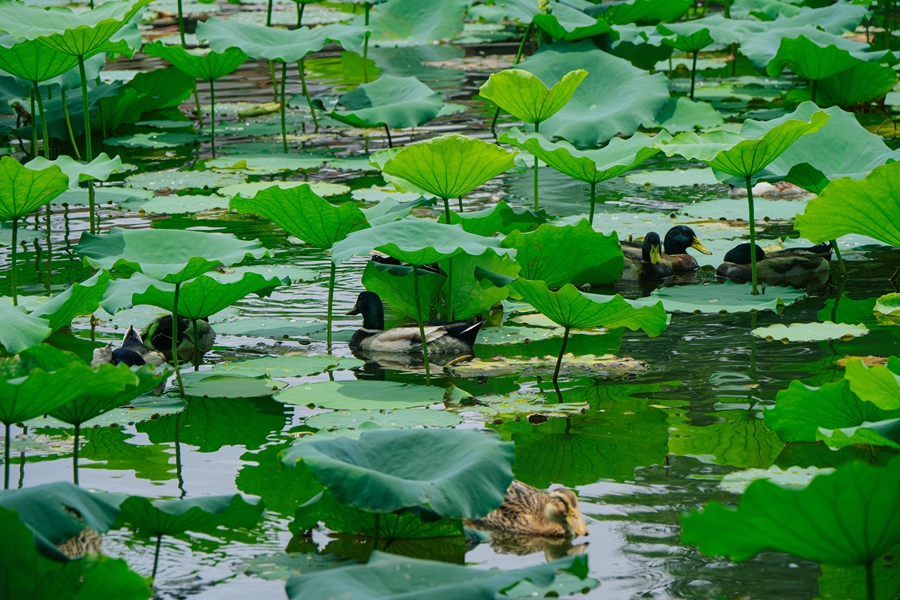 成隊(duì)的鴨子在蓮葉間嬉戲。