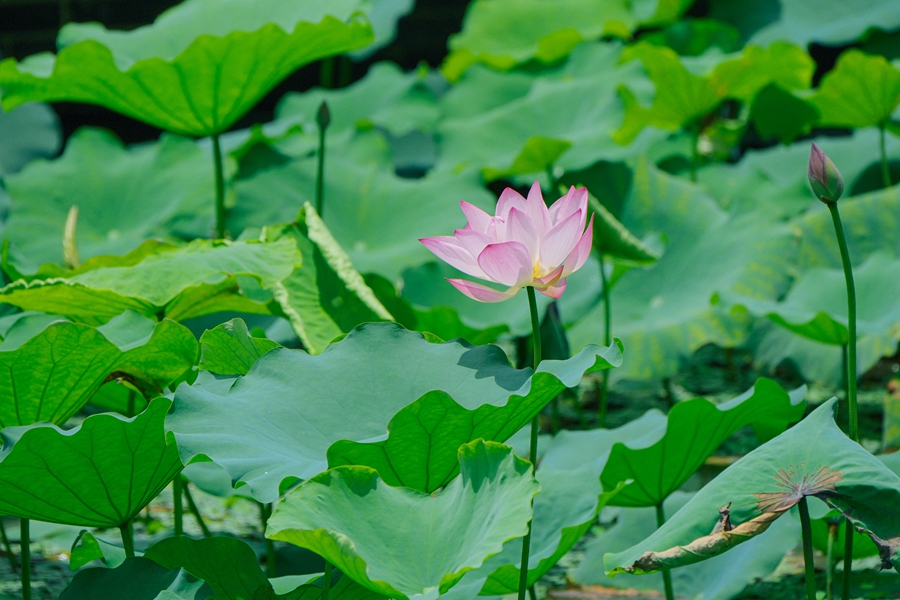 撩人的微風(fēng)包裹著蓮葉的清香,游人劃著小舟蕩漾在湖水之中。平湖碧波,水光瀲滟,初夏的愜意莫過(guò)于此。