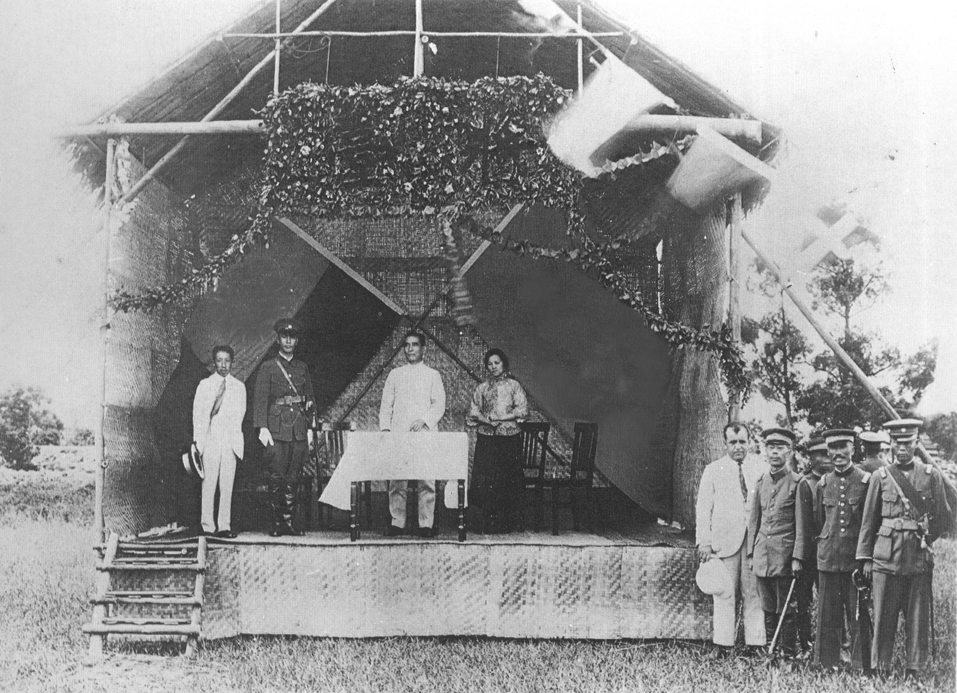 1924年6月16日,黃埔軍校舉行開學典禮。主席臺左起:廖仲愷、蔣介石、孫中山、宋慶齡。惠州日報記者嚴藝超 翻拍