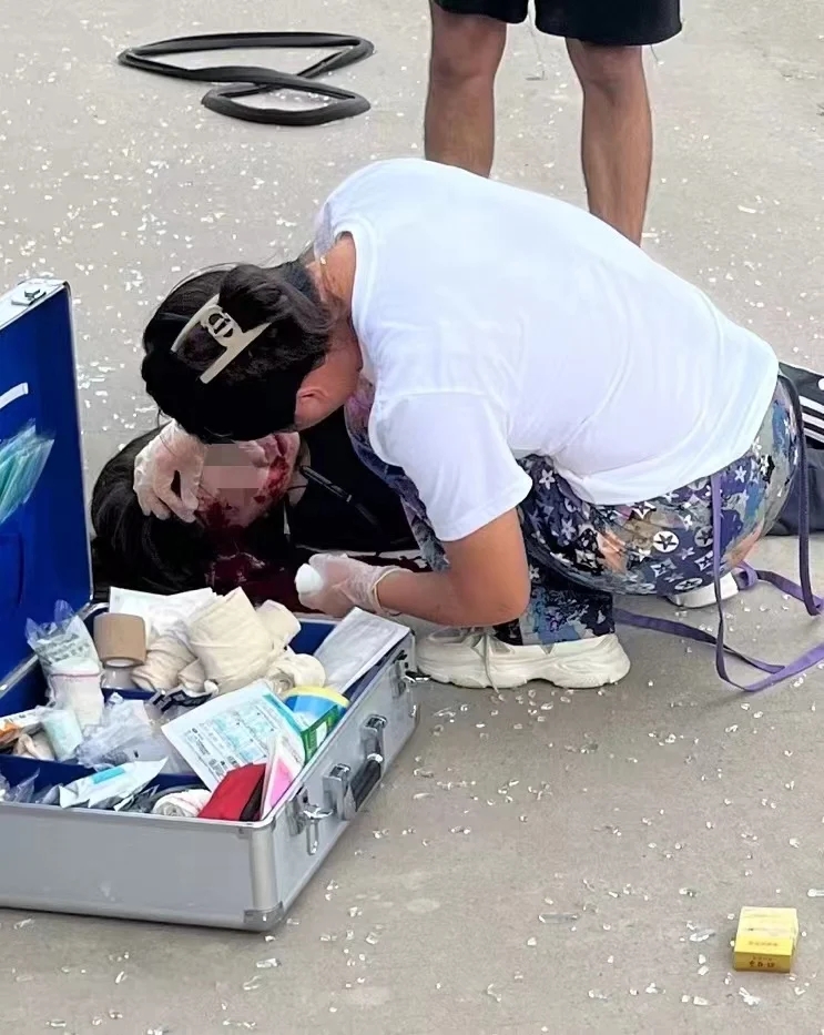 當時,一位女士被一輛小汽車撞倒在地,肇事車輛玻璃碎片散落一地,傷者遭到猛烈撞擊導(dǎo)致頭部和嘴角大量出血。胡萍駕車途經(jīng)時目睹了整個車禍過程。情況緊急,她立刻將車輛?吭诼愤,從車上取出急救箱,跑到傷者身邊,亮明紅十字救護員身份后立即對其展開急救。