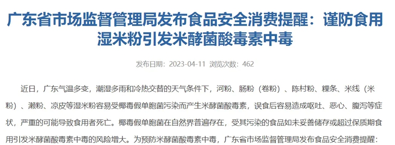 2020年7月28日,廣東省揭陽市惠來地區(qū)也發(fā)生了一起食用河粉(粿條)導致的食物中毒事件,11人中毒,1人死亡,也是米酵菌酸毒素。