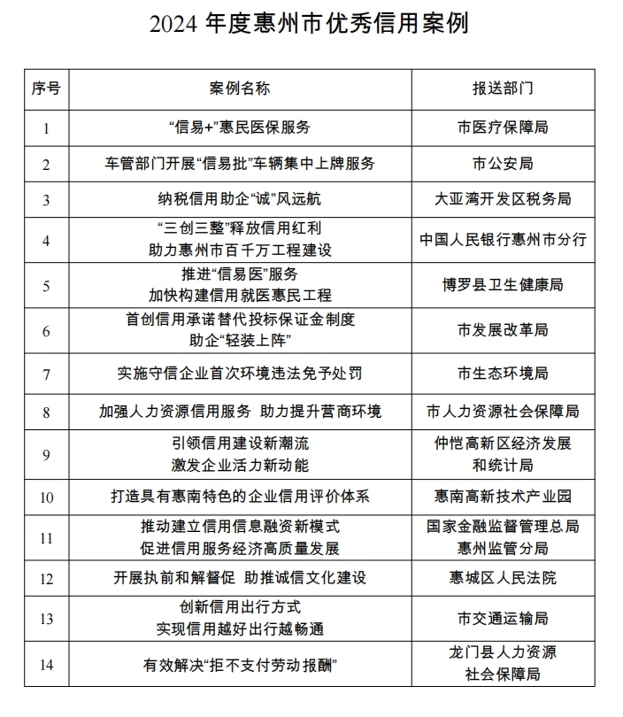 惠州日?qǐng)?bào)訊 (記者邱若蓉 通訊員張春芳)人無信不立,業(yè)無信不興。6月19日,記者從惠州市發(fā)展和改革局獲悉,惠州市2024年度優(yōu)秀信用案例公布,共有14個(gè)典型案例入選。
