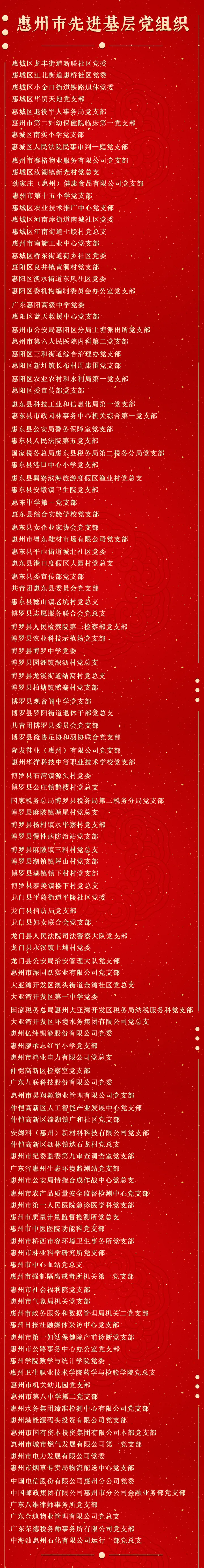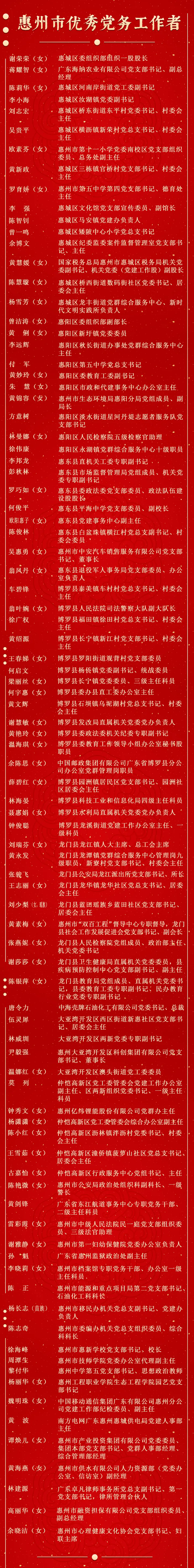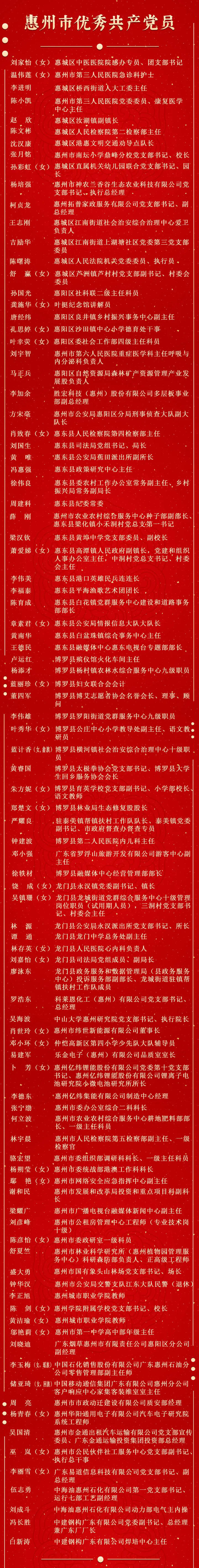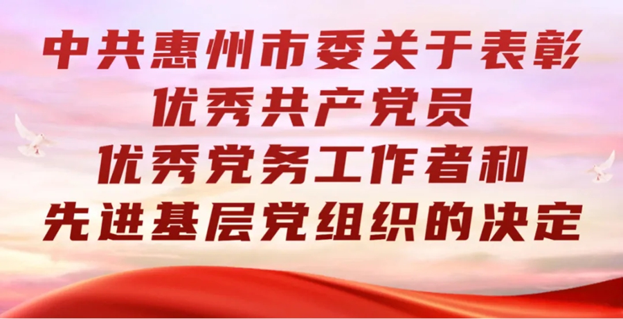 為表彰先進、弘揚正氣,激勵全市各級黨組織和廣大黨員再接再厲、擔當作為,加快打造廣東高質量發(fā)展新增長極,市委決定,授予劉家怡等96名同志“惠州市優(yōu)秀共產(chǎn)黨員”稱號,授予謝榮榮等91名同志“惠州市優(yōu)秀黨務工作者”稱號,授予惠城區(qū)龍豐街道新聯(lián)社區(qū)黨委等122個黨組織“惠州市先進基層黨組織”稱號。