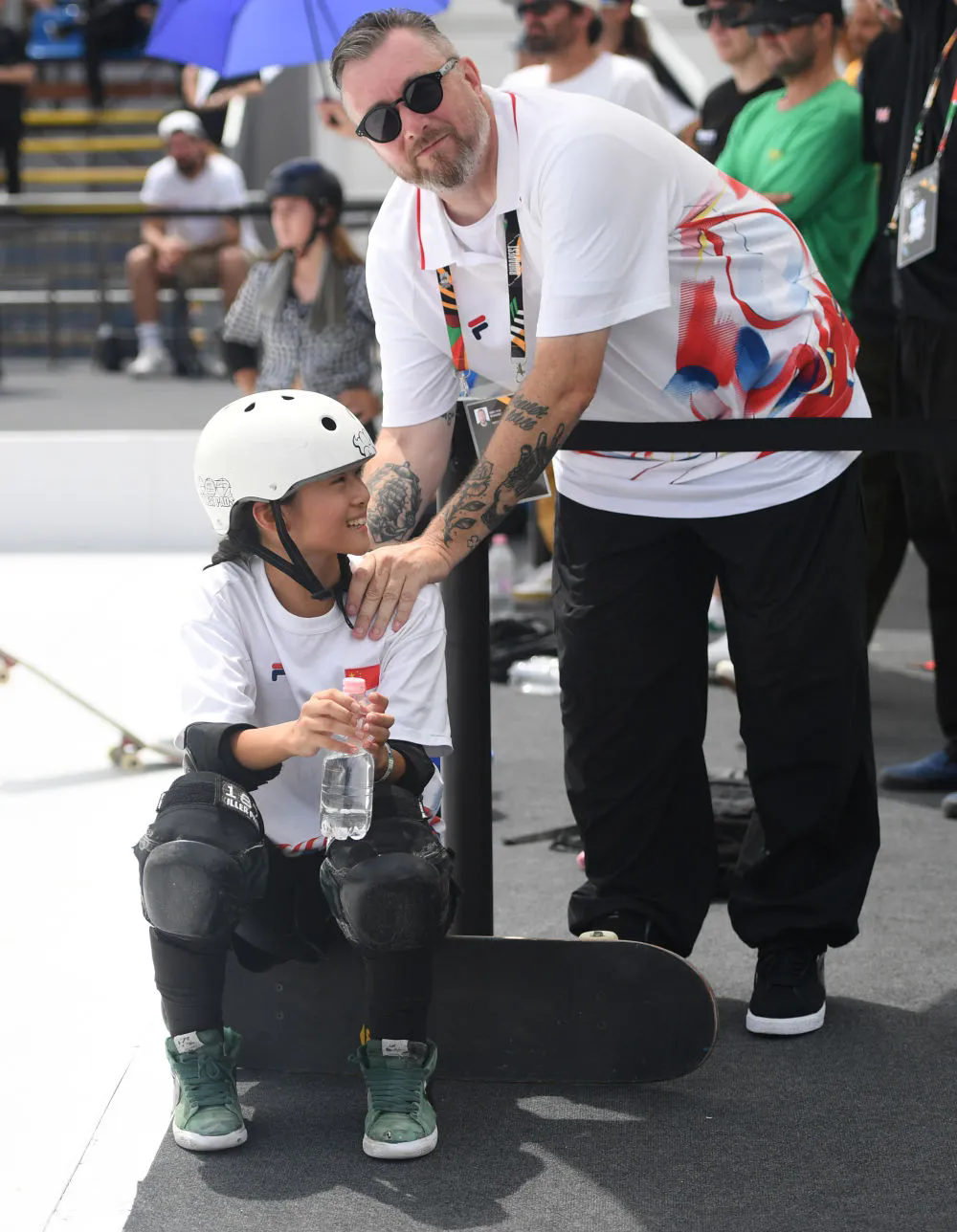 6月20日,鄭好好(左)在比賽間隙與教練互動,她在預(yù)賽中最佳成績?yōu)?2.60分。當(dāng)日,巴黎奧運會資格系列賽布達(dá)佩斯站滑板女子碗池預(yù)賽在布達(dá)佩斯舉行。新華社記者 賀燦鈴 攝