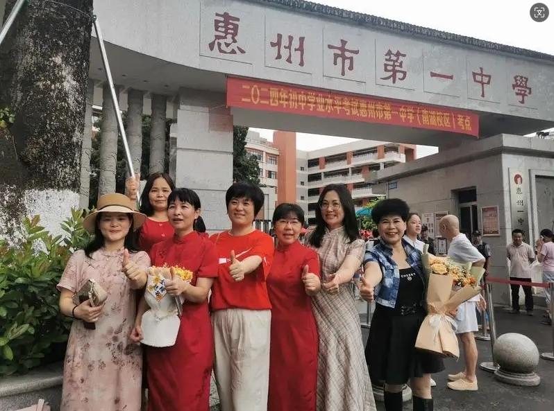 惠州市第一中學南湖校區(qū)考點外,不少家長穿著紅色旗袍或是紅色T恤前來送考。