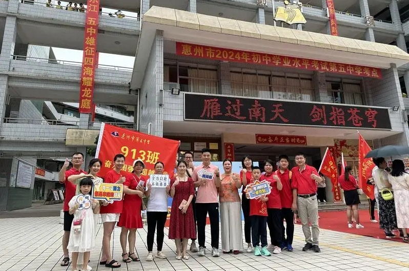 在惠州市第五中學,老師和家長們組成親友團為考生們加油助威。