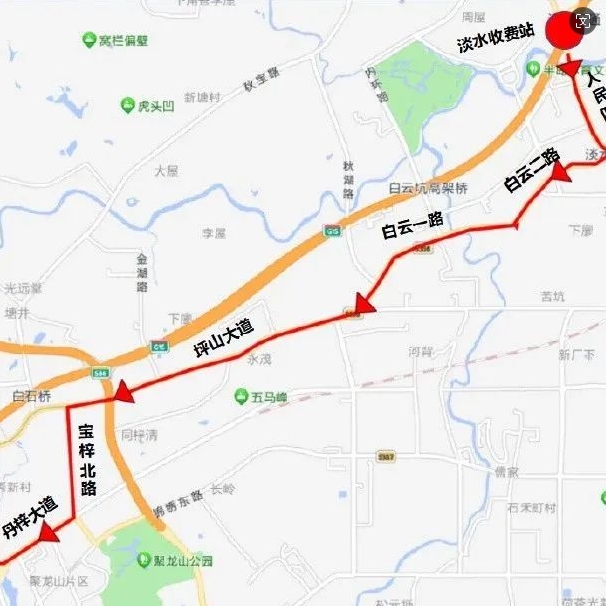 原經(jīng)淡水收費站深圳方向上行匝道上高速的車輛,可繞行人民四路→白云二路→白云一路→坪山大道→寶梓北路→丹梓大道→綠梓大道→坑梓收費站上高速。