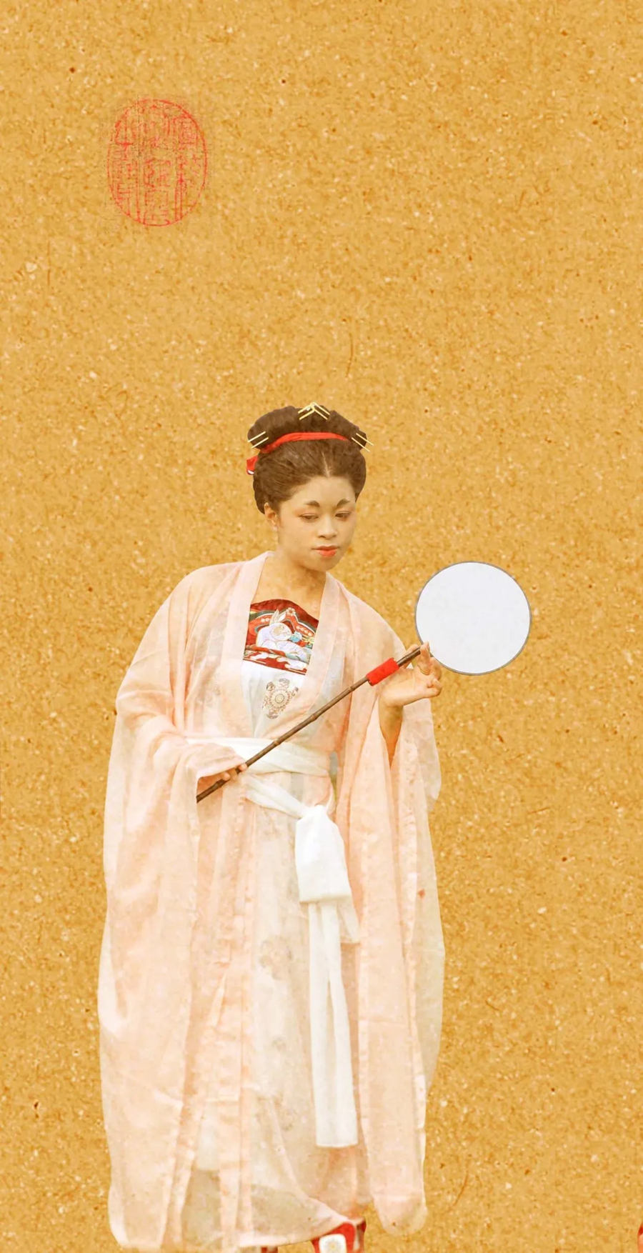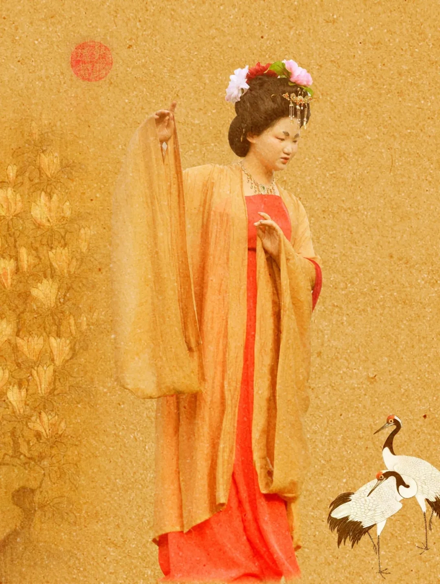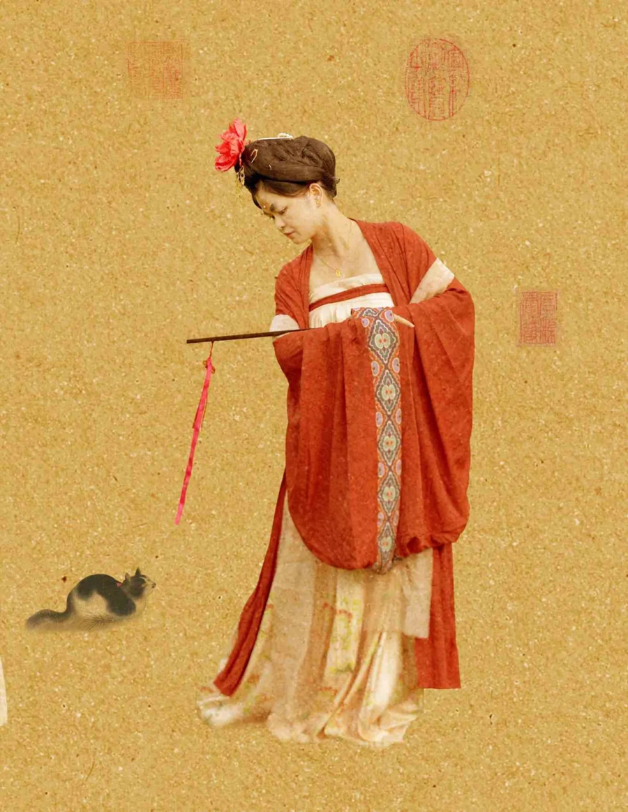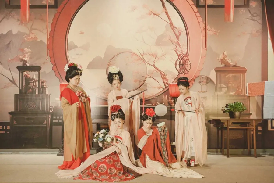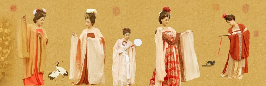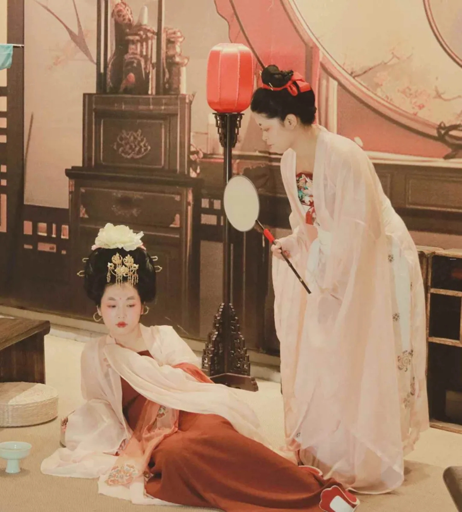 她們妝容精致,眉如遠山含翠,唇似點朱砂,再現(xiàn)了唐代女性的妝容特點;她們舉止優(yōu)雅,步態(tài)輕盈,仿佛從畫中走來,在畫中鏡中如遇畫中人。