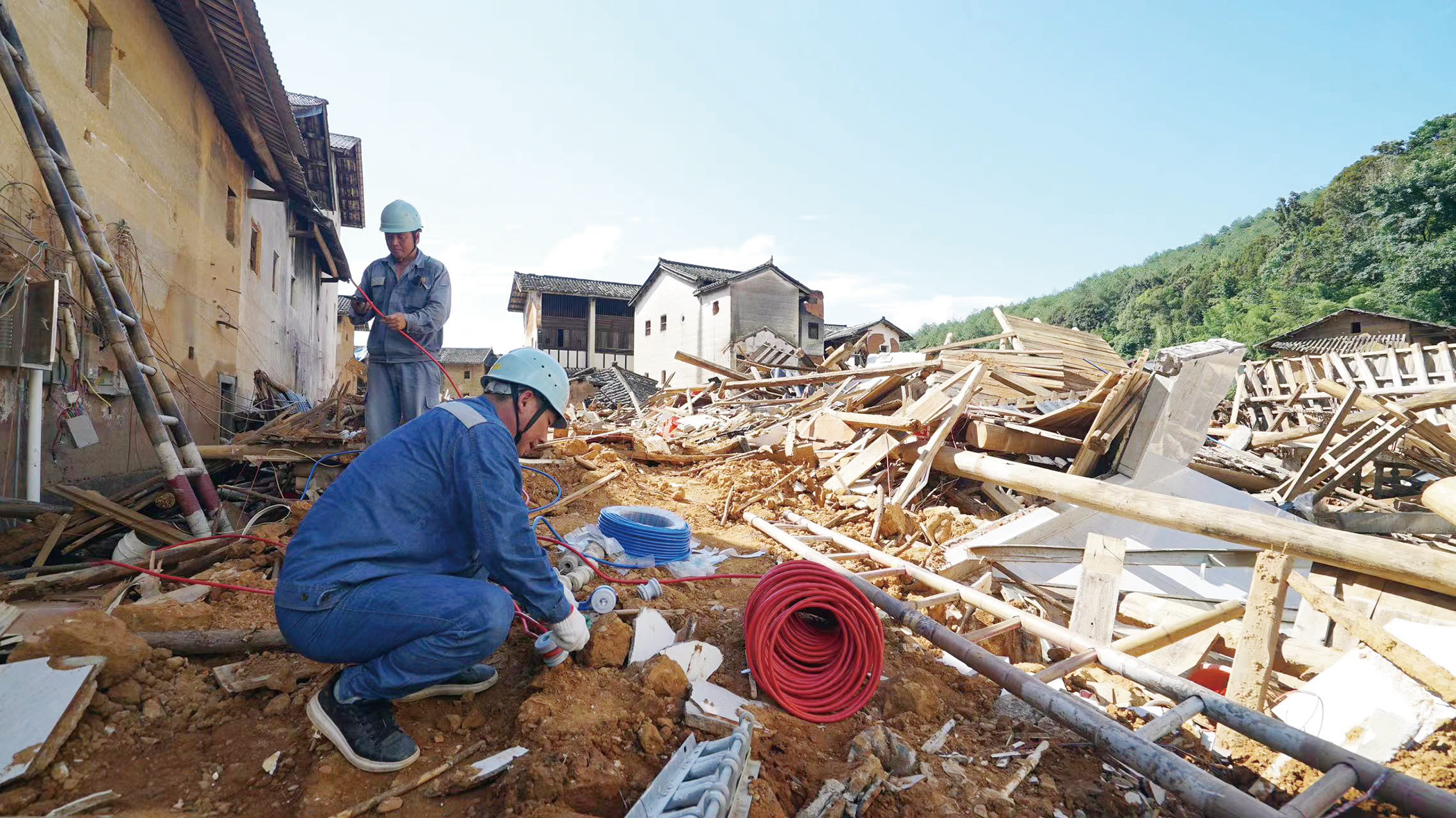 惠州供電局支援梅州蕉嶺縣,現(xiàn)場搶修恢復(fù)古寨村居民用電街碼。陳世杰 攝