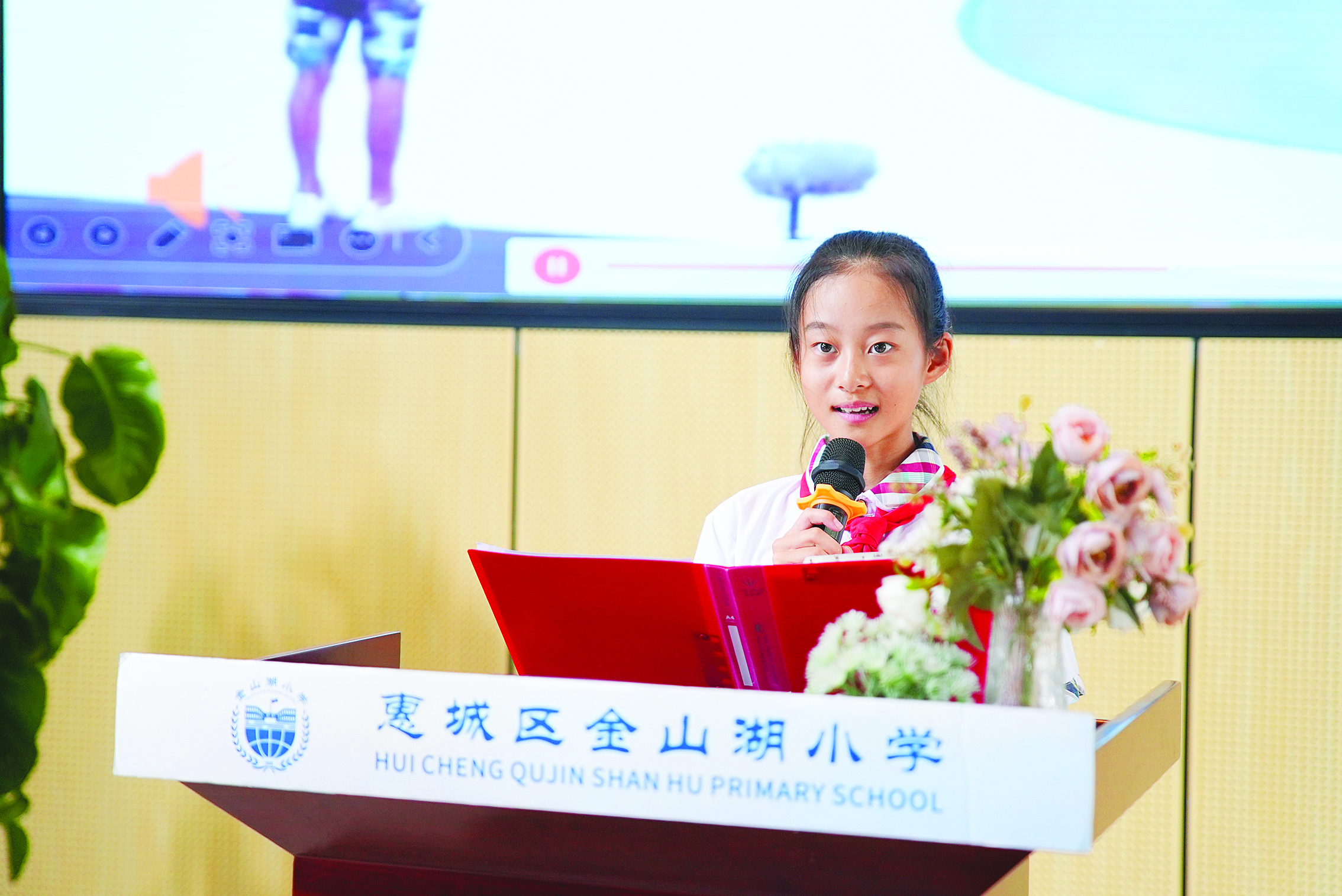 7月5日,鄭好好作為金山湖小學六年級畢業(yè)生代表發(fā)言。 惠州日報記者羅劍業(yè) 黃鑫威 攝
