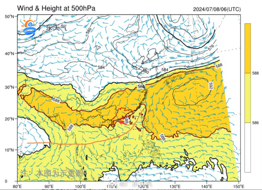 關(guān)注:①高溫炎熱,注意防暑防曬。②雖有副高罩著,但低層南風較活躍,熱力不穩(wěn)定條件好,注意防御局地強對流。