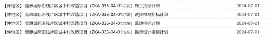 近日,惠州市公共資源交易中心連發(fā)4條公告,均與莞惠城際沿線片區(qū)城中村改造項目ZKA-033-04-01地塊有關,包括施工招標、勘探設計招標、監(jiān)理招標以及試驗檢測招標等,預示著這宗仲愷城市改造地塊已進入了實質性進展階段。