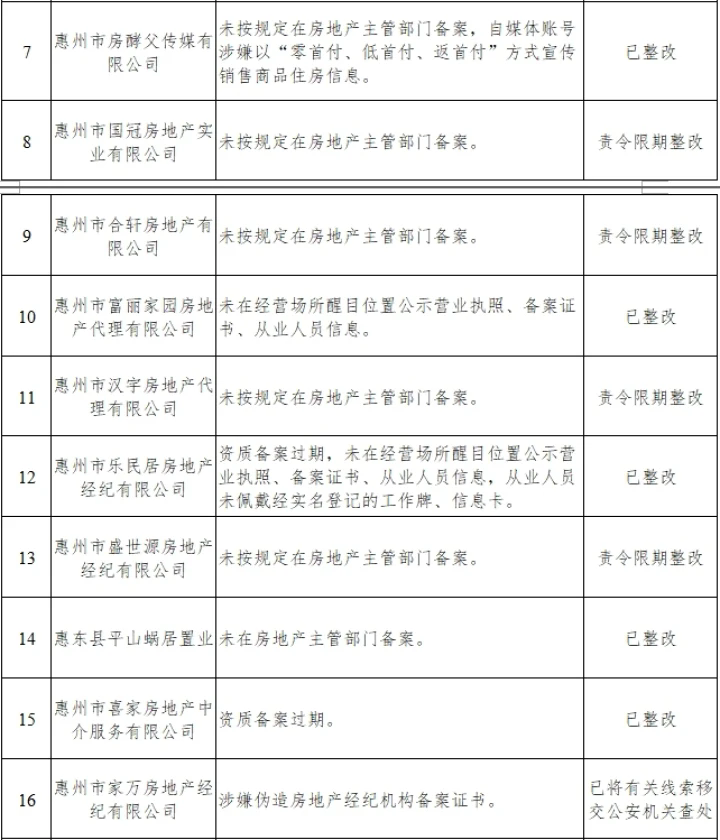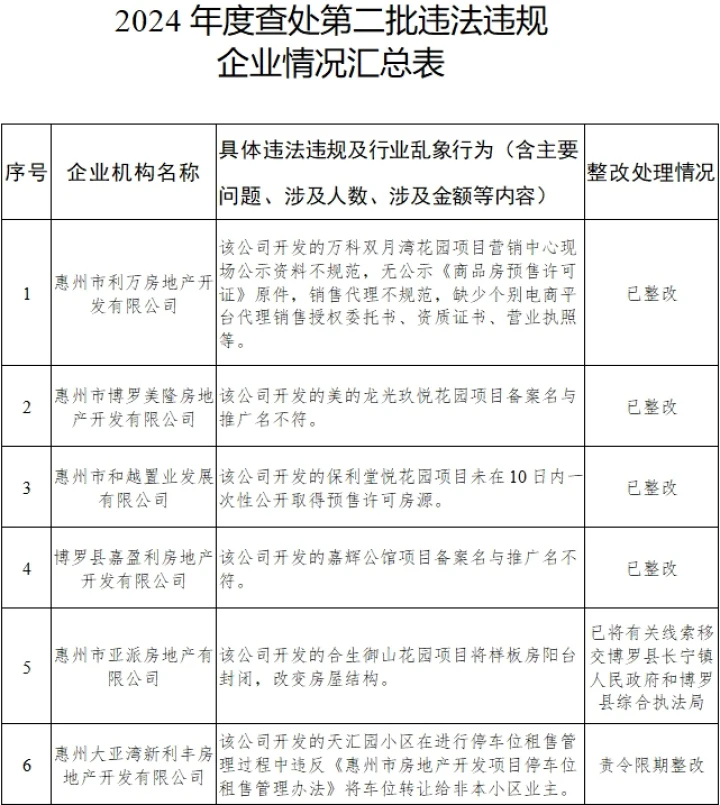 7月8日,惠州市房地產(chǎn)市場監(jiān)督管理工作領(lǐng)導小組辦公室發(fā)布《關(guān)于2024年度查處第二批違法違規(guī)房地產(chǎn)開發(fā)企業(yè)、中介機構(gòu)和物業(yè)服務(wù)企業(yè)名單的公告》,18家房地產(chǎn)開發(fā)企業(yè)、中介機構(gòu)和物業(yè)服務(wù)企業(yè)涉嫌違規(guī)而被查處。目前,部分違規(guī)情況已經(jīng)整改。