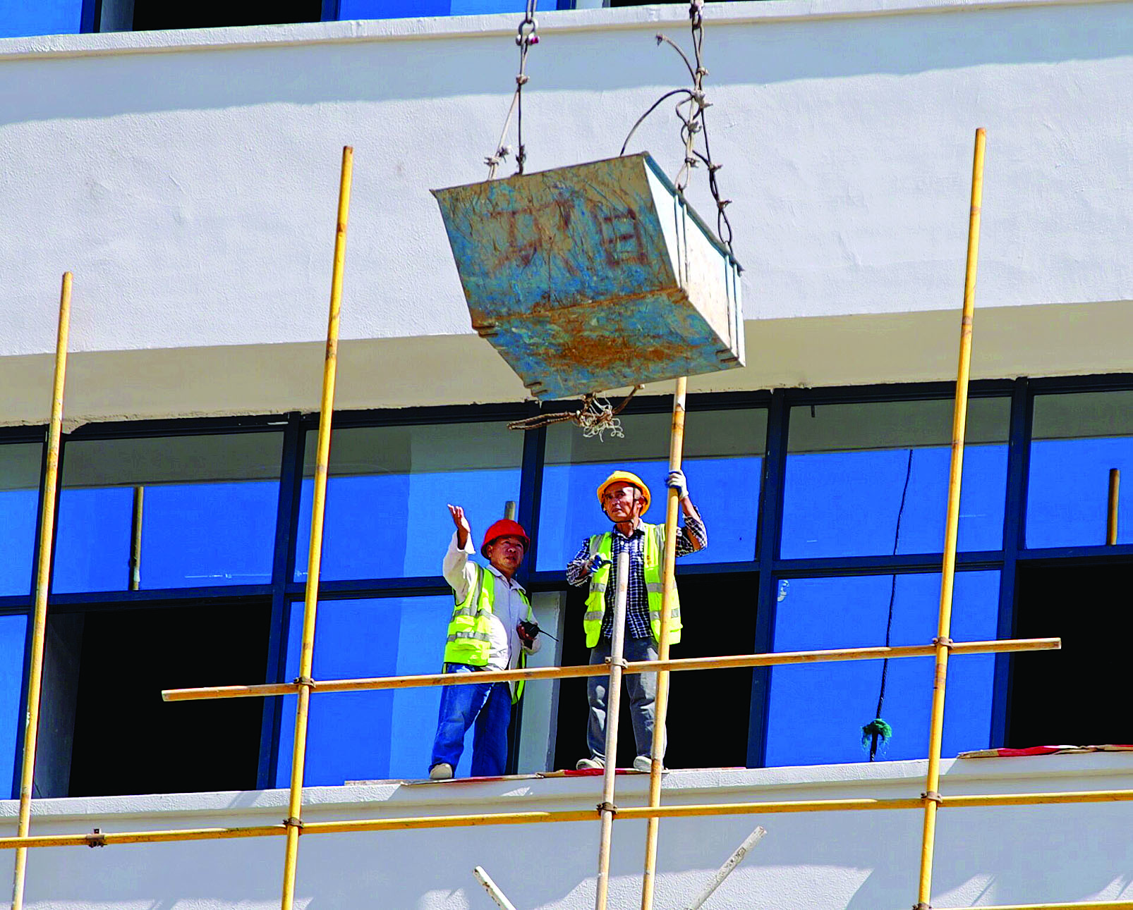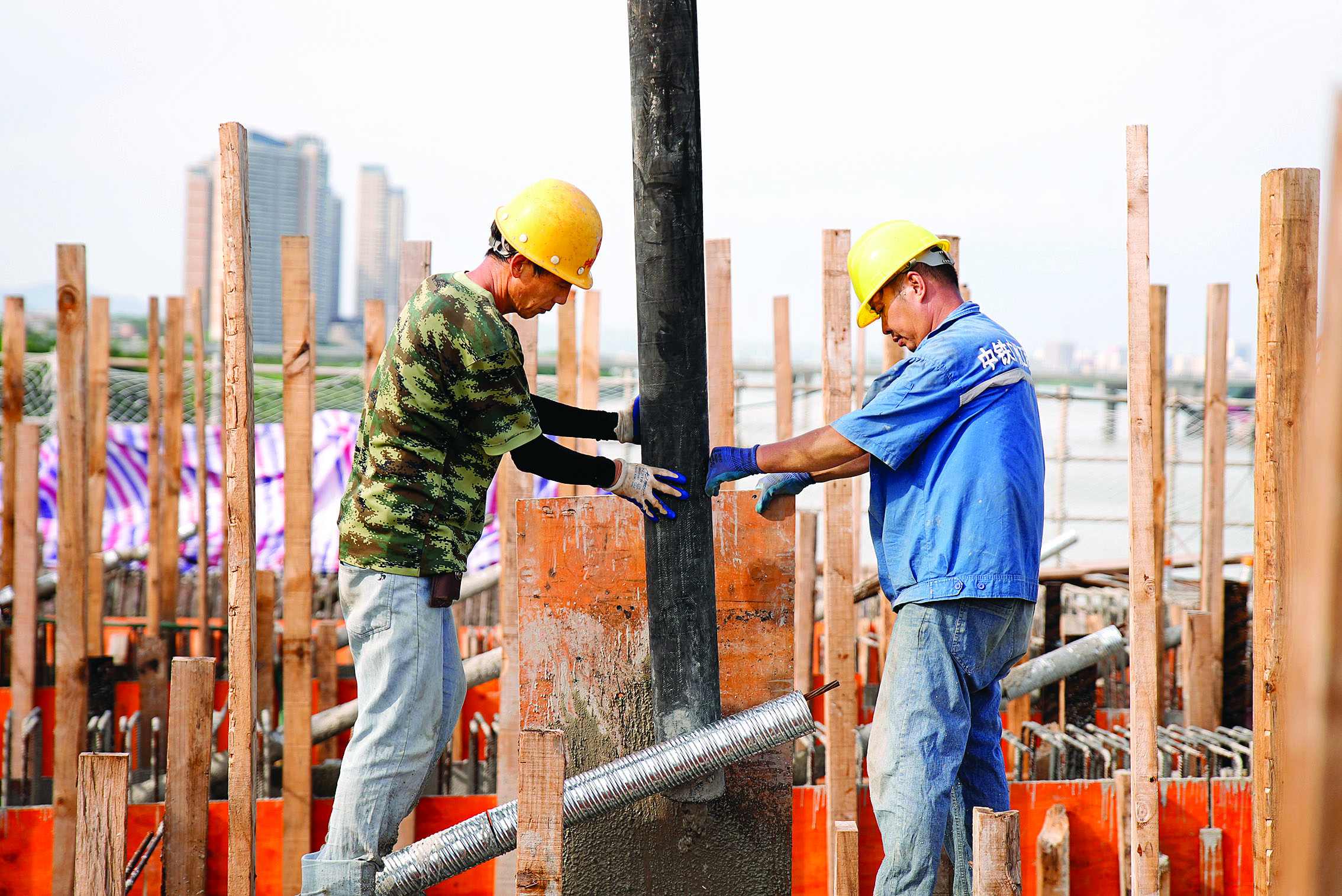 鵝城大橋建設(shè)現(xiàn)場(chǎng),工人在烈日下澆筑水泥。