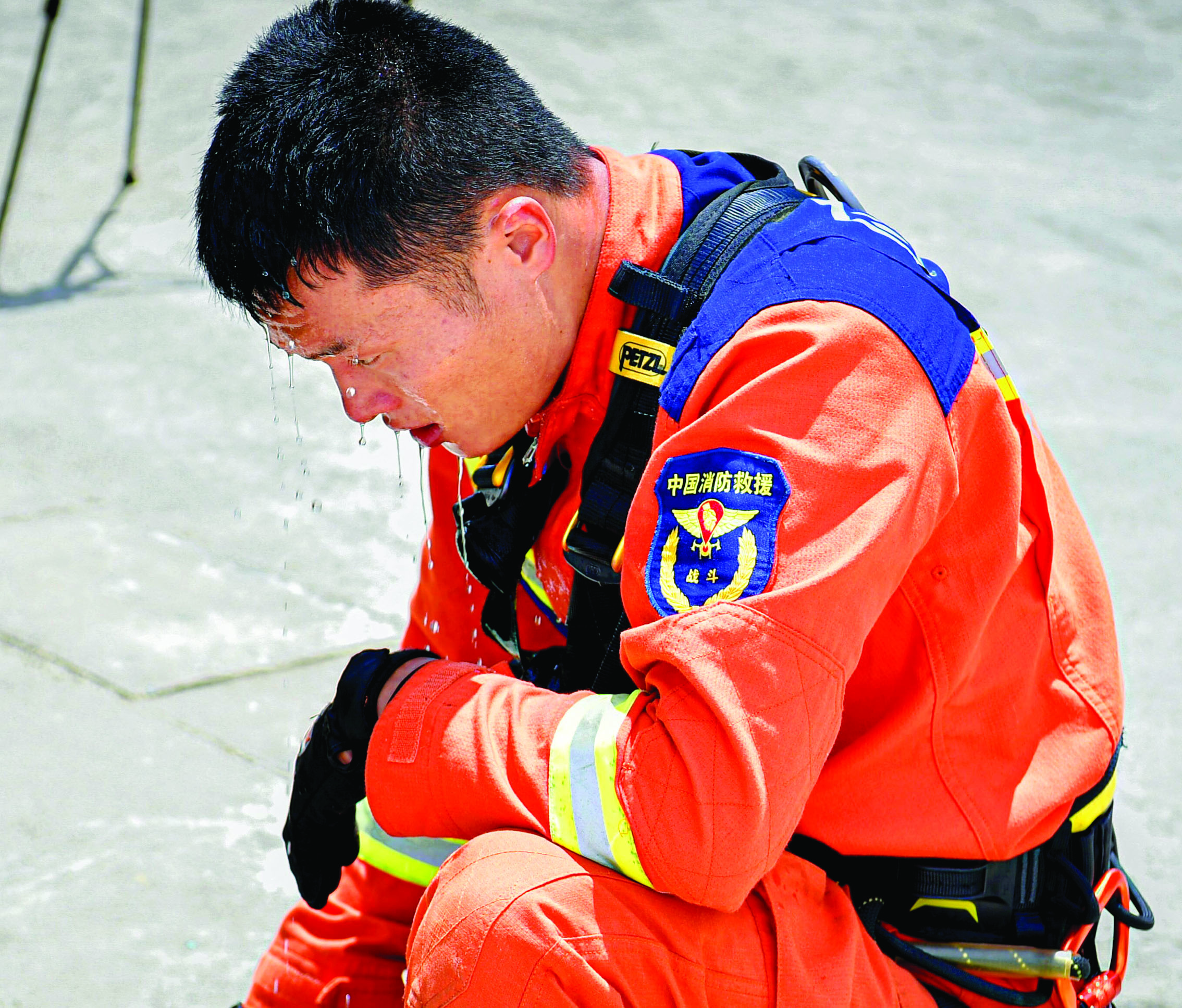 消防隊(duì)員訓(xùn)練后用水洗臉降溫。