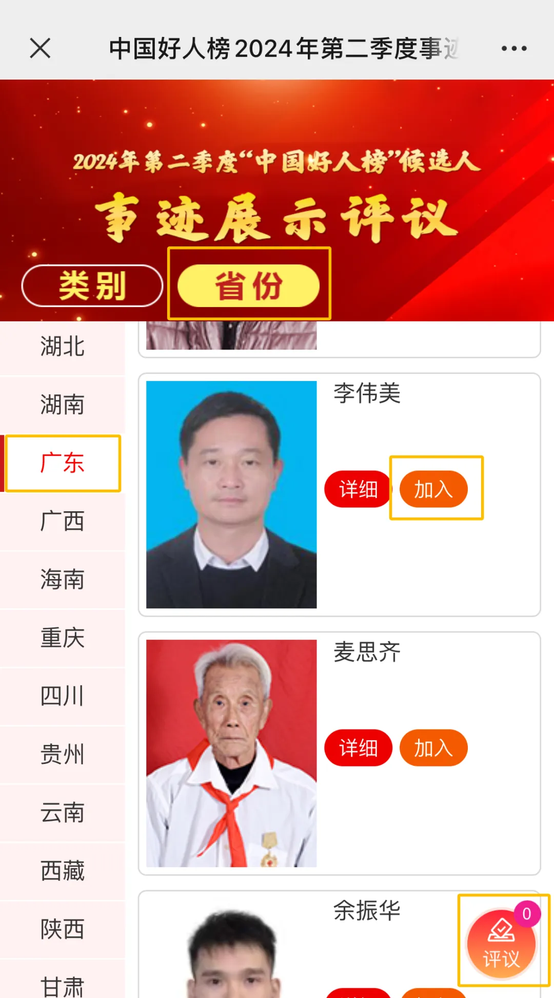 1.在頁面點(diǎn)擊“省份-廣東”,將候選人“加入”列表,點(diǎn)擊右下角“評(píng)議”。