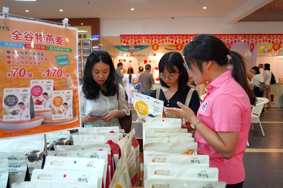 勁家莊(惠州)健康食品有限公司內(nèi),人們在購買食品。
