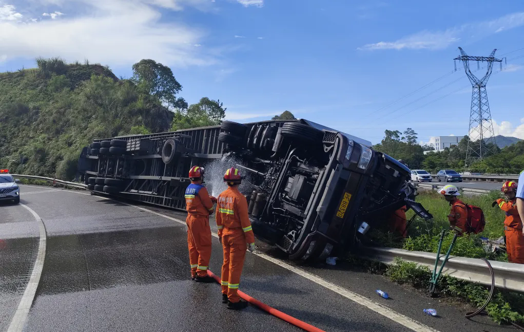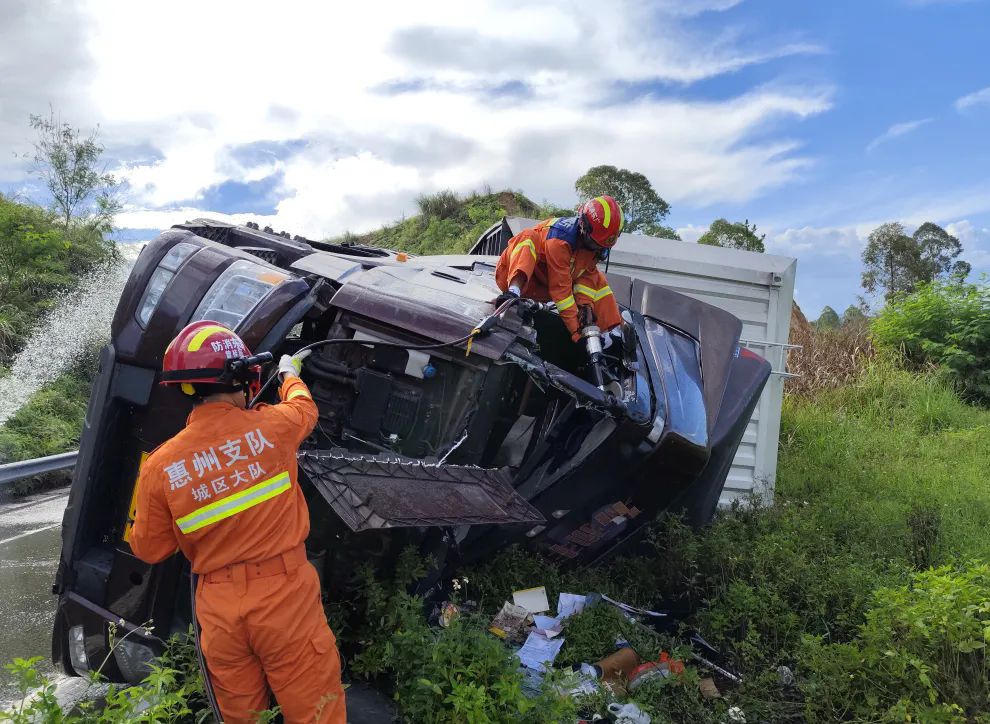 現(xiàn)場(chǎng)消防員了解到,一輛快遞貨運(yùn)掛車(chē)由浙江出發(fā)前往東莞,途徑甬莞高速轉(zhuǎn)惠大高速立交橋,在高速匝道發(fā)生側(cè)翻,導(dǎo)致油箱漏液。一名被困人員已被救出,另外一名駕駛員因車(chē)頭撞擊嚴(yán)重變形導(dǎo)致雙腿被卡無(wú)法脫困。