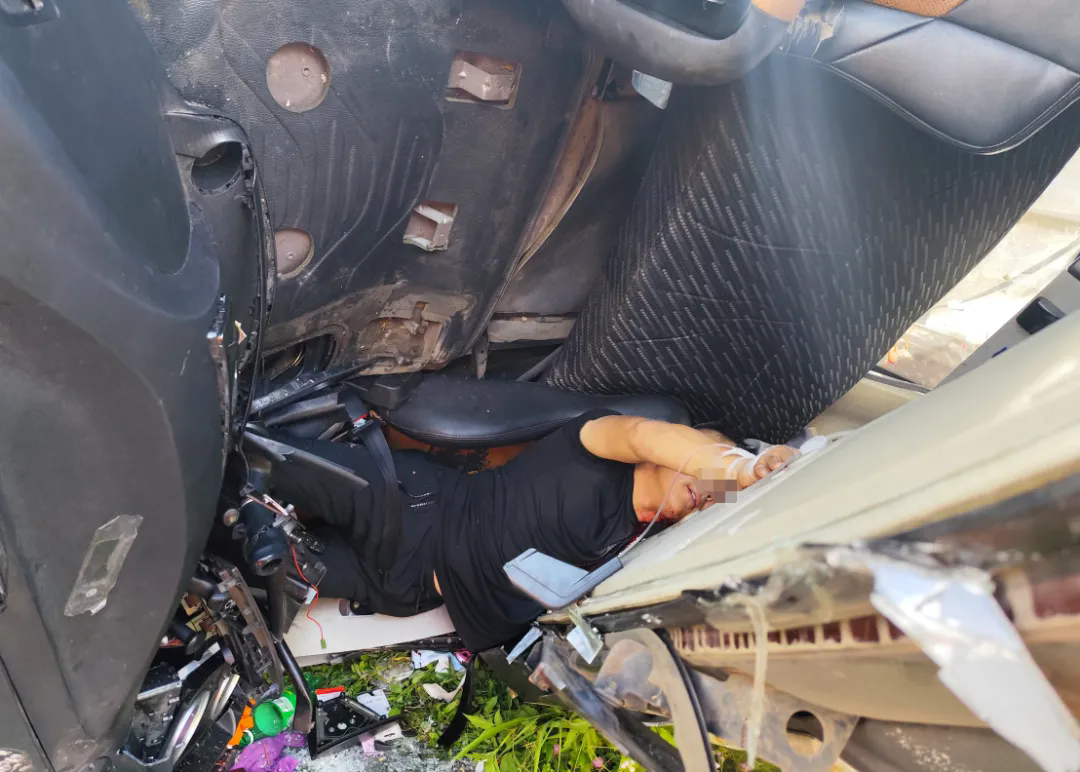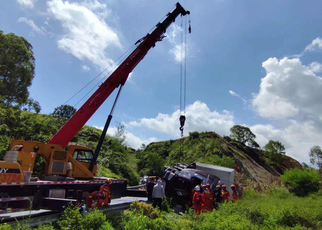 救援人員立即出水對(duì)漏油稀釋防止起火,同時(shí)采用破拆、擴(kuò)張裝備開(kāi)辟救生道路。由于車(chē)輛駕駛室嚴(yán)重變形導(dǎo)致破拆困難,高速交警根據(jù)現(xiàn)場(chǎng)情況溝通調(diào)派一輛吊車(chē)到場(chǎng),吊車(chē)通過(guò)不同點(diǎn)位牽引車(chē)頭,配合消防救援人員破拆救援。