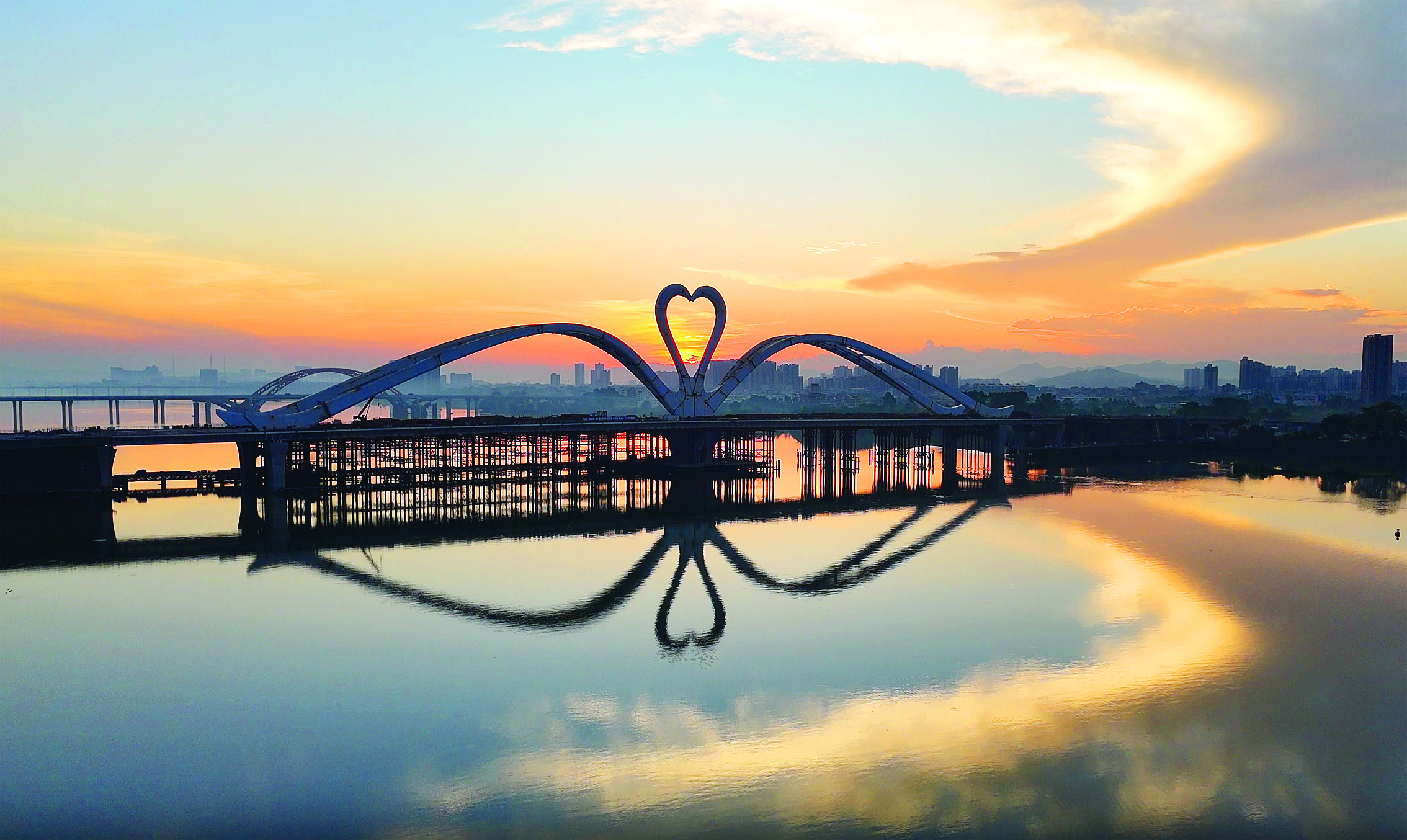 在惠州,連大橋都是愛你的形狀,這是屬于惠州人的浪漫。清晨,朝霞染紅天空,惠州鵝城大橋“雙鵝”相依,修長的“鵝頸”拼成一個愛心形狀,美不勝收。鵝城大橋以東江之“水”、惠州之“鵝”為主要元素進(jìn)行演繹設(shè)計,藝術(shù)造型蘊(yùn)含“天鵝引頸高歌”的美好寓意。鵝城大橋計劃年內(nèi)建成通車;葜萑請笥浾咄踅 攝