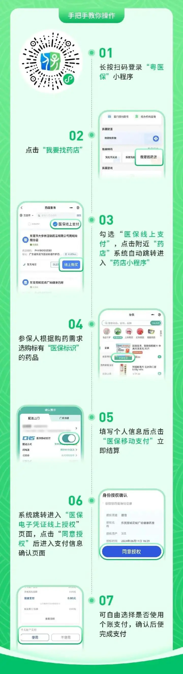 參保人通過“粵醫(yī)!毙〕绦,在支付寶和微信平臺訪問定點醫(yī)藥機構(gòu)獨立購藥小程序、定點醫(yī)藥機構(gòu)的合作線上購藥服務(wù)渠道等多種渠道,選購標(biāo)有“醫(yī)保標(biāo)識”的藥品,點擊“醫(yī)保移動支付”即可使用醫(yī)保個人賬戶支付藥品費用。