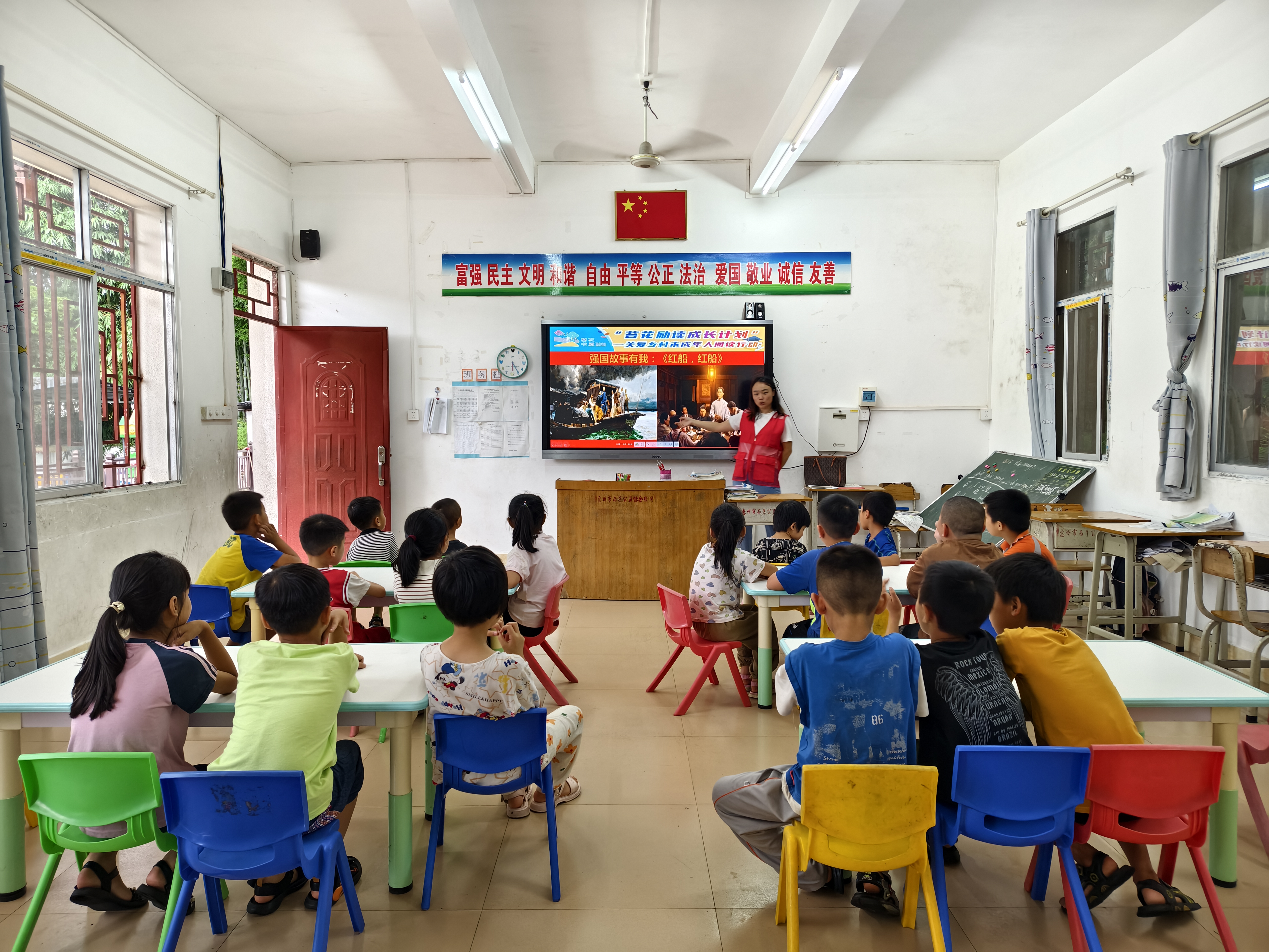 志愿者為孩子們講述《紅船,紅船》繪本故事。