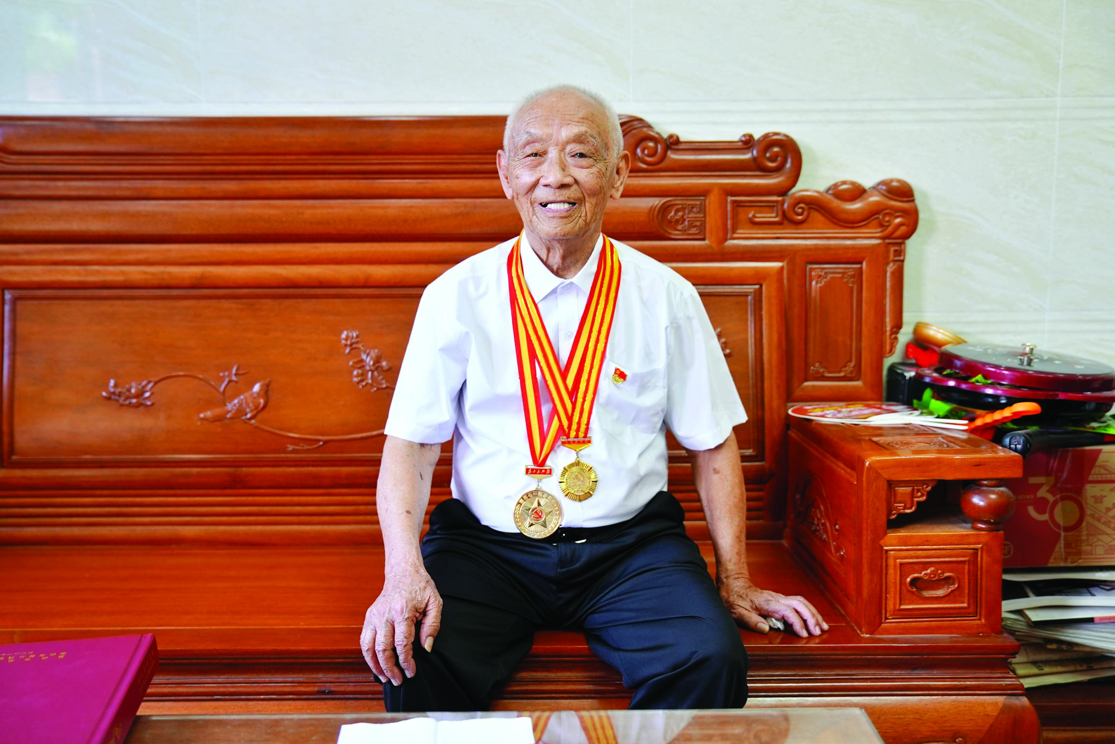 得知記者要來(lái)家里采訪,朱厚早早換上了新的白襯衫,戴好黨員徽章,老照片、獎(jiǎng)?wù)潞妥C書(shū)等整齊地?cái)[放在茶幾上。7月初,這位102歲的老黨員,來(lái)到惠州市“兩優(yōu)一先”表彰大會(huì)暨“三個(gè)第一”發(fā)布儀式現(xiàn)場(chǎng),獲頒“三個(gè)第一”紀(jì)念證書(shū)。