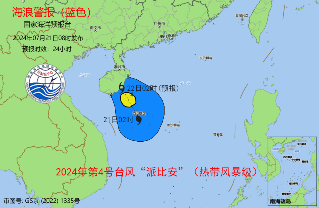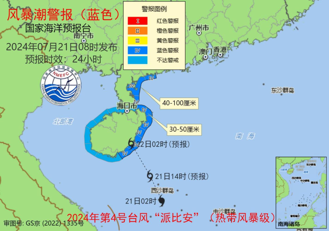 風(fēng)暴潮方面,預(yù)計7月21日下午至22日上午,海南島沿海將出現(xiàn)30到50厘米的風(fēng)暴增水,廣東茂名至雷州半島東岸沿海將出現(xiàn)40到100厘米的風(fēng)暴增水。海南省?谑、廣東省茂名市和湛江市的風(fēng)暴潮預(yù)警級別為藍(lán)色。