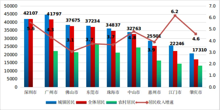 2023年上半年珠三角9市居民人均可支配收入及增速(單位:元、%)