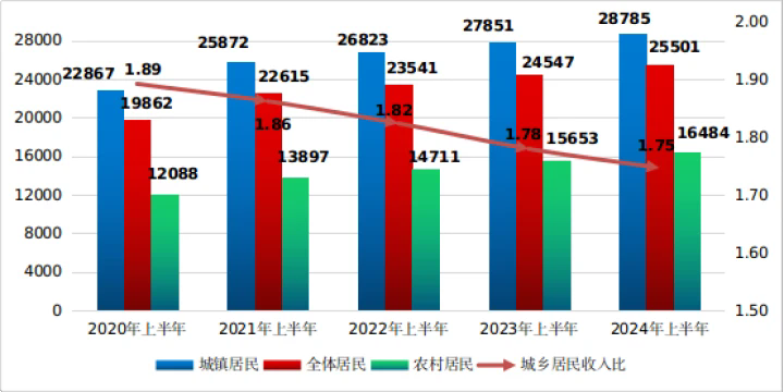分城鄉(xiāng)來看,上半年惠州城鎮(zhèn)居民人均可支配收入28785元,同比增長3.4%;農(nóng)村居民人均可支配16484元,同比增長5.3%。城鄉(xiāng)居民收入比為1.75:1,比2023年上半年降低0.03,城鄉(xiāng)居民收入比進(jìn)一步縮小。