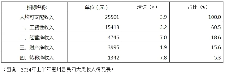 調(diào)查數(shù)據(jù)顯示,2024年上半年惠州居民人均可支配收入25501元,同比增長3.9%,比2023年上半年增速回落0.4個(gè)百分點(diǎn),收入絕對值位居珠三角九市第七位,增速排珠三角九市第六位。
