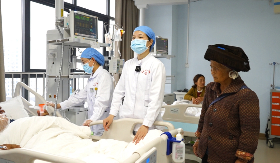 走進(jìn)貞豐縣人民醫(yī)院重癥監(jiān)護(hù)病房,里面住著七八個病人,監(jiān)護(hù)儀上顯示著病人的血氧、血壓、心率等信息。這里住著一位老阿婆,今年75歲,長期患有冠心病,兩年前摔倒后一直在家臥床,出現(xiàn)肌肉萎縮。吳連月走近病床,協(xié)助老人翻身拍背,檢查皮膚情況及促進(jìn)患者痰液排出,指導(dǎo)家屬翻身拍背技巧并進(jìn)行相關(guān)知識宣教。“嬢嬢長期臥床,容易發(fā)生壓瘡及感染,要記得定時翻身拍背!眳沁B月說。