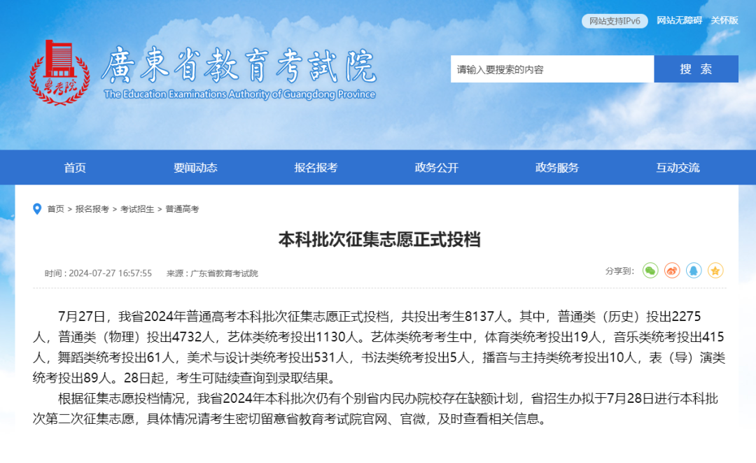 7月27日,廣東2024年普通高考本科批次征集志愿正式投檔,共投出考生8137人。目前,仍有個別省內(nèi)民辦院校存在缺額計劃,省招生辦擬于7月28日進行本科批次第二次征集志愿。