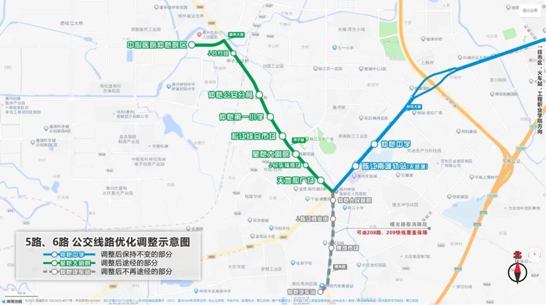 線路調(diào)整:取消5路仲愷人民醫(yī)院、陳江商業(yè)街、集成市場、仲愷汽車站等4個站點(diǎn),改由曙光路口延伸經(jīng)甲子路、康僑大道至中心醫(yī)院仲愷院區(qū)。