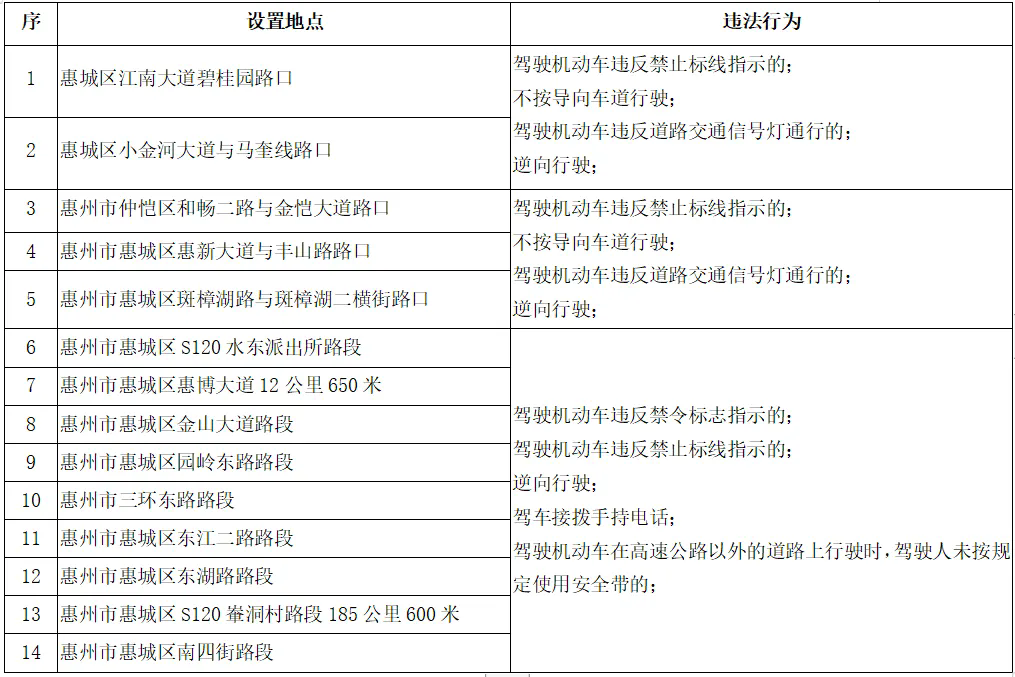 根據(jù)《中華人民共和國(guó)行政處罰法》、《道路交通安全違法行為處理程序規(guī)定》相關(guān)規(guī)定,惠州市公安機(jī)關(guān)交通管理部門(mén)在原有監(jiān)控設(shè)備公布基礎(chǔ)上,對(duì)部分固定式交通技術(shù)監(jiān)控設(shè)備設(shè)置地點(diǎn)向社會(huì)公布。