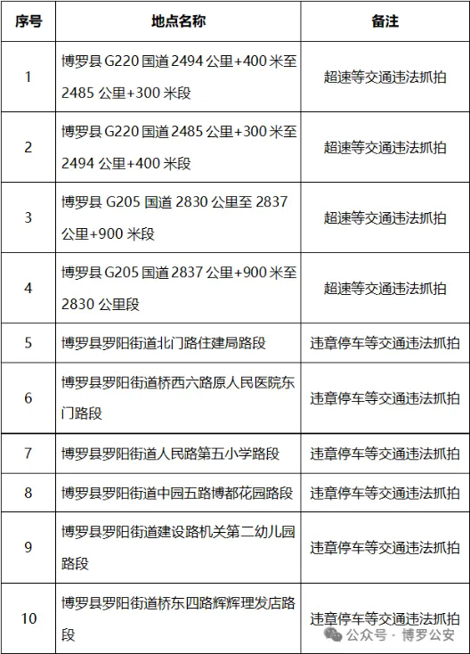 根據(jù)《中華人民共和國(guó)行政處罰法》第四十一條及《道路交通安全違法行為處理程序規(guī)定》第十六條關(guān)于“固定式交通技術(shù)監(jiān)控設(shè)備地點(diǎn)應(yīng)向社會(huì)公布”的規(guī)定,博羅縣轄區(qū)范圍內(nèi)近期新增的視頻監(jiān)控點(diǎn)位公布: