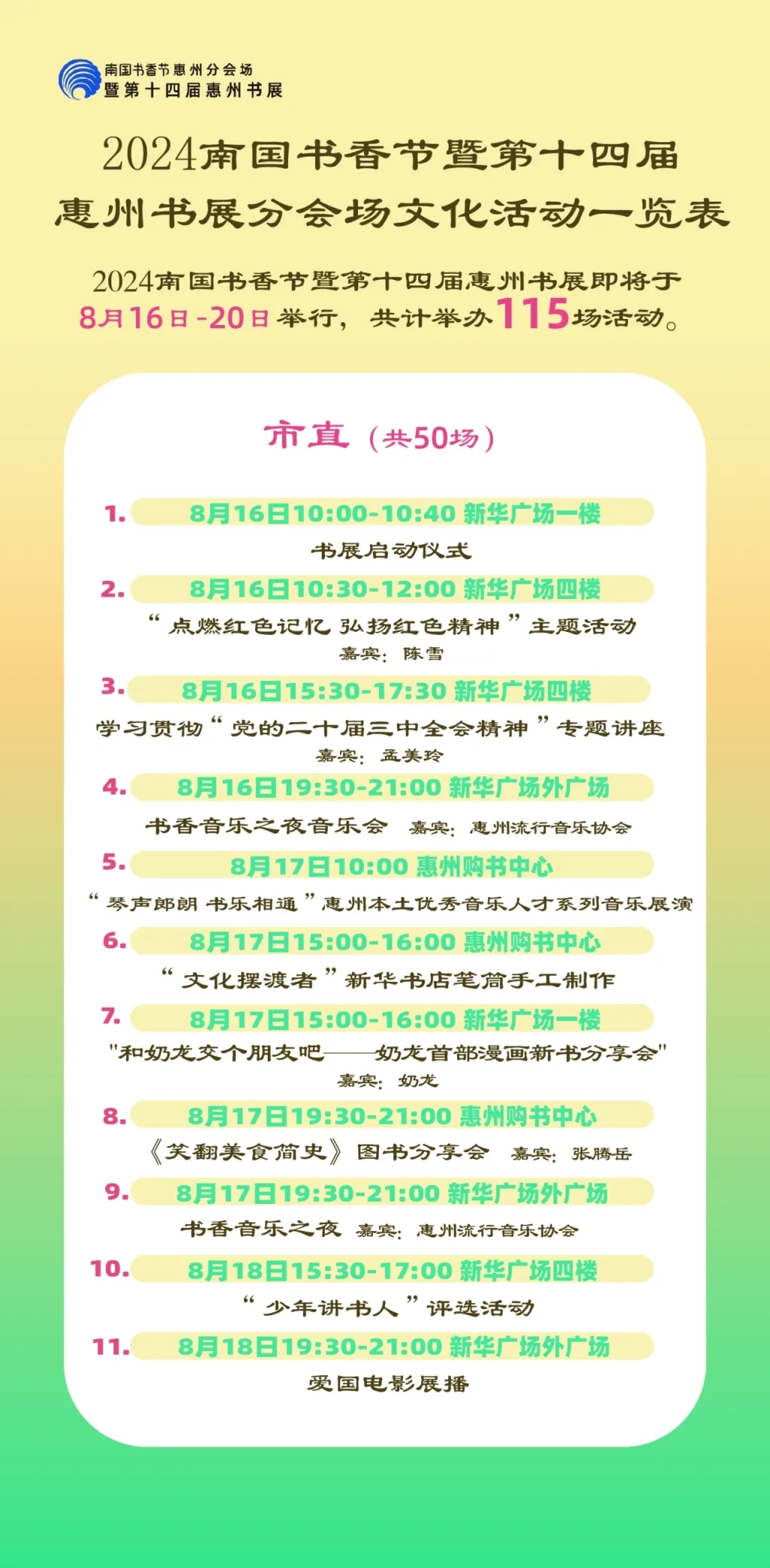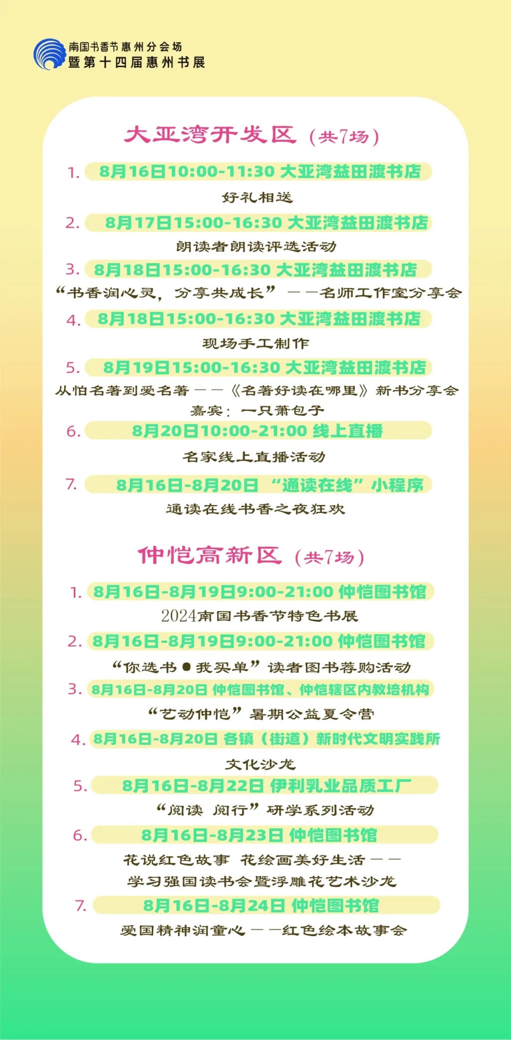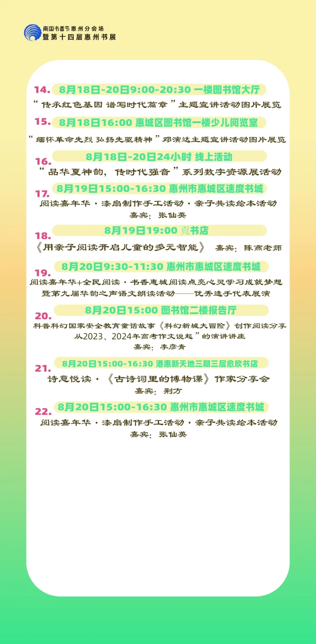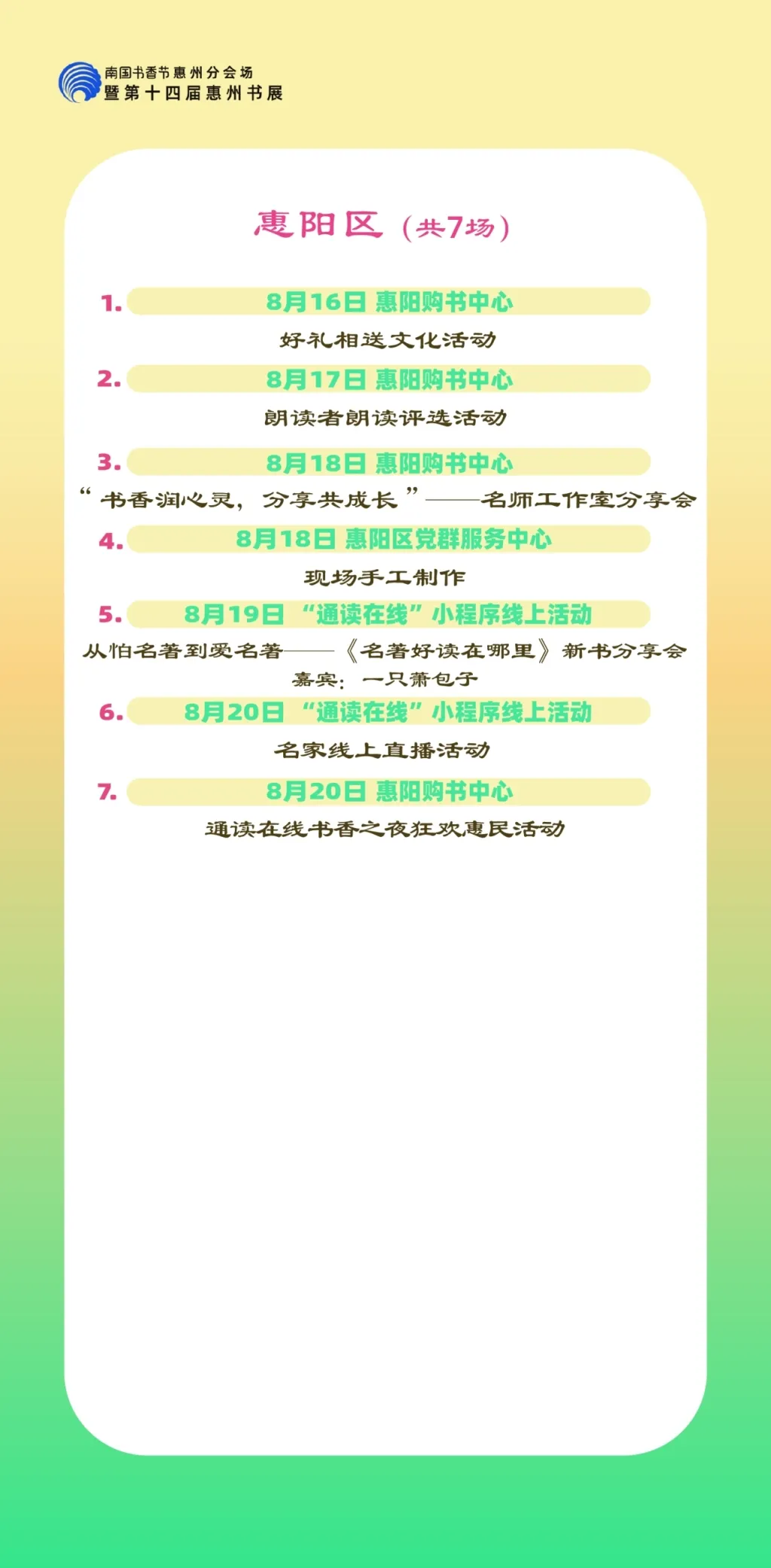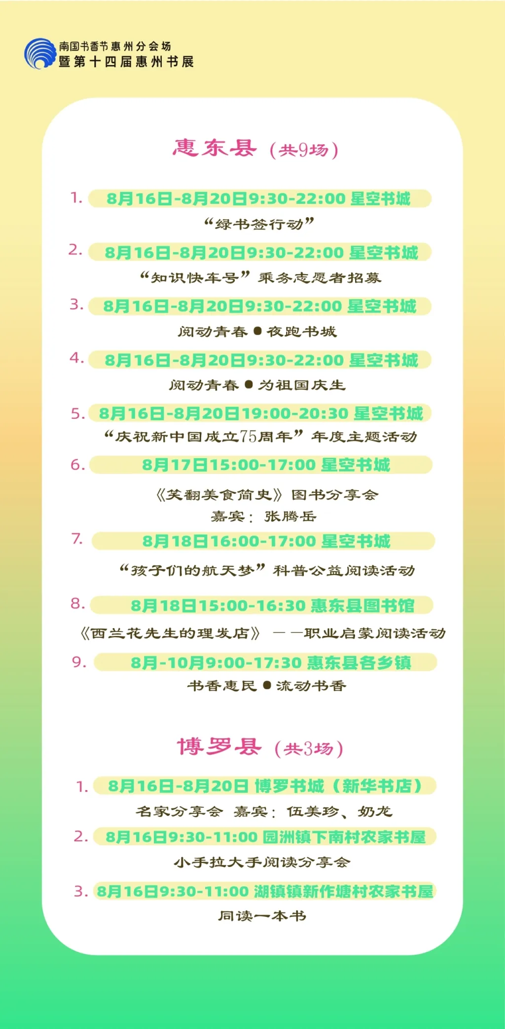包括各縣區(qū)分會(huì)場(chǎng),以及惠州市圖書館、東坡書房、豐湖書院、惠享書房、加速度書城、覔書店、愈欣書店,各縣區(qū)新時(shí)代文明實(shí)踐所(站)等