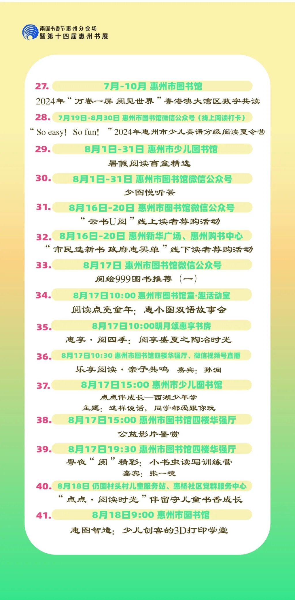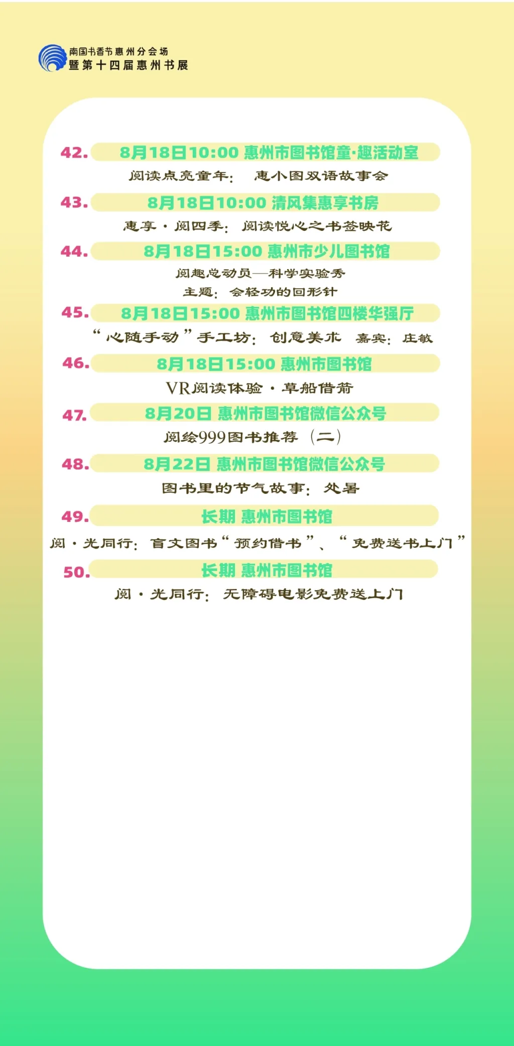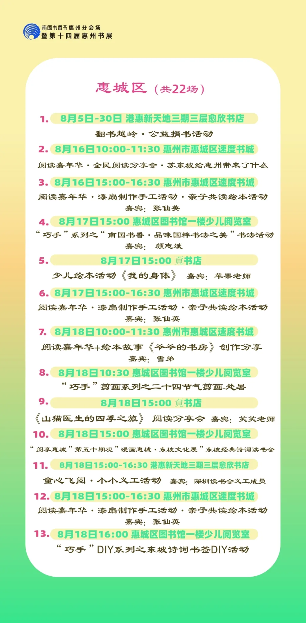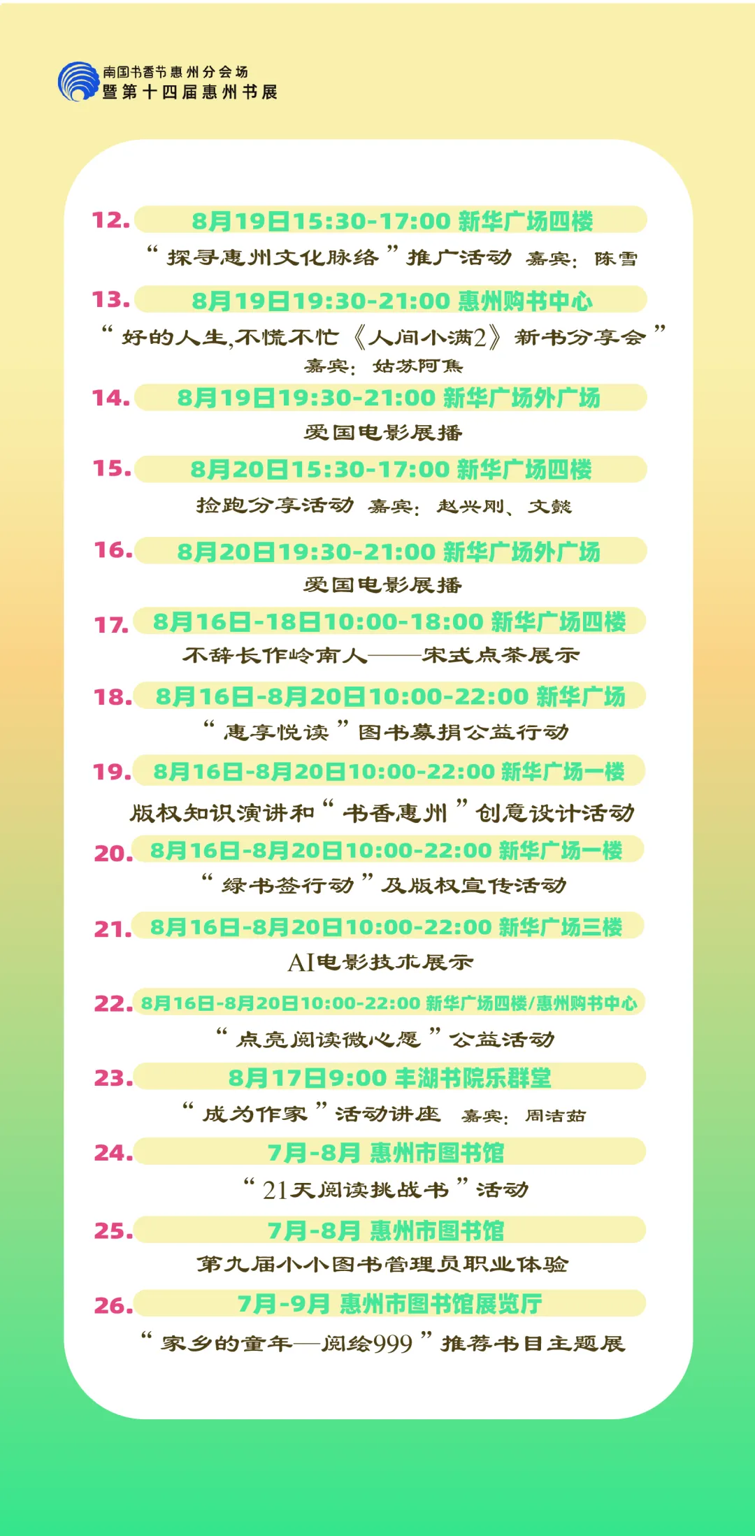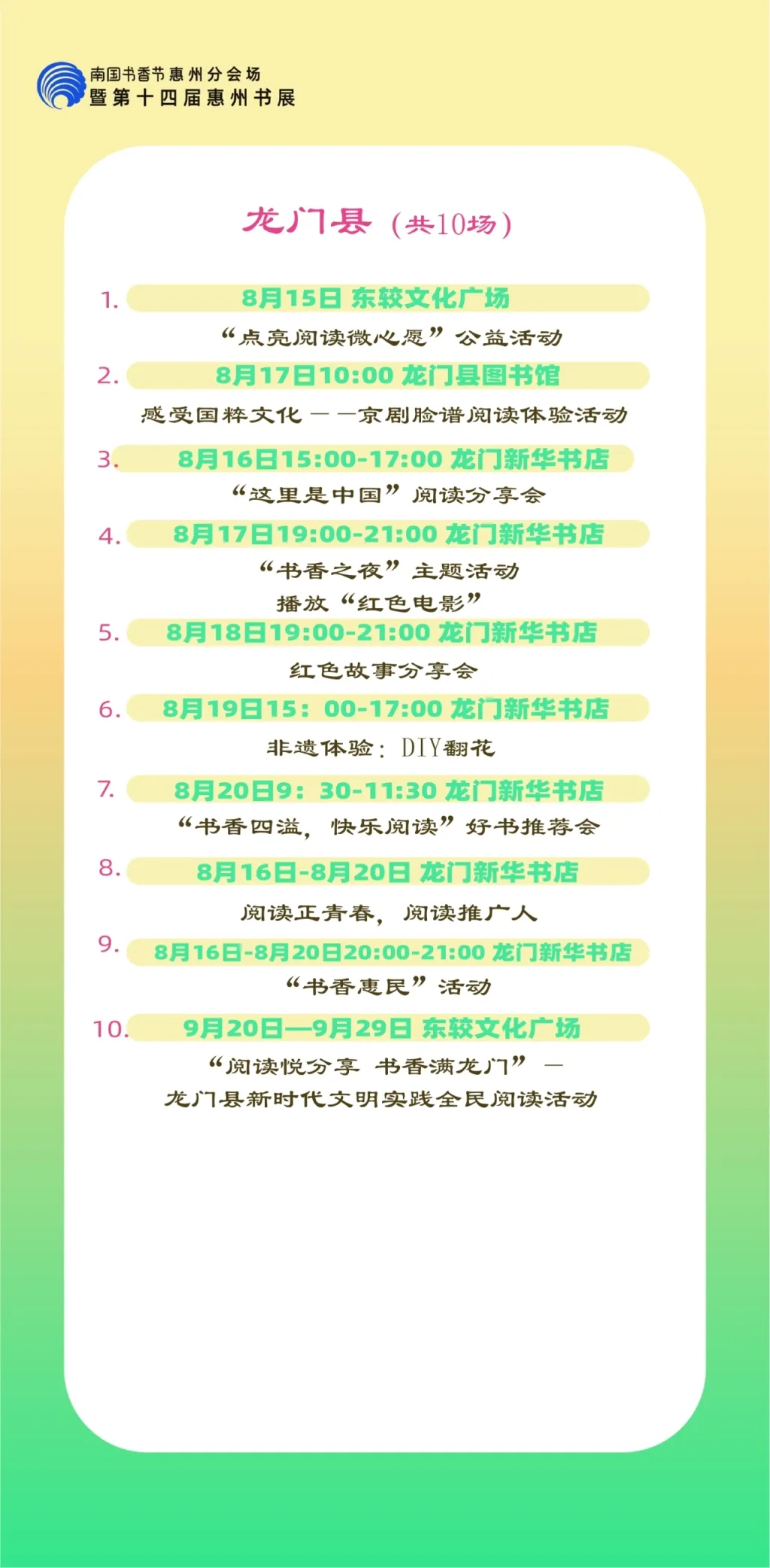 包括各縣區(qū)分會(huì)場(chǎng),以及惠州市圖書館、東坡書房、豐湖書院、惠享書房、加速度書城、覔書店、愈欣書店,各縣區(qū)新時(shí)代文明實(shí)踐所(站)等