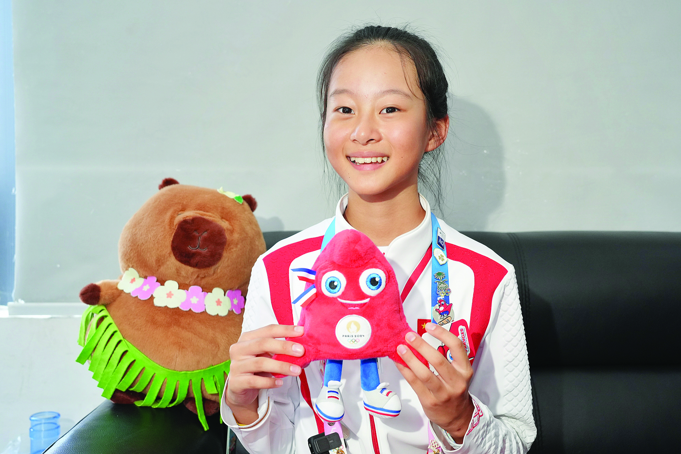 穿著紅白相間的國家隊(duì)服,脖子上的運(yùn)動(dòng)員證掛著各種pin(奧運(yùn)徽章),手拿著巴黎奧運(yùn)會(huì)吉祥物“弗里熱”,鄭好好帶著招牌式燦爛笑容回到了夢開始的地方——惠州市體育運(yùn)動(dòng)學(xué)校的滑板場;葜菔形幕瘡V電旅游體育局為鄭好好準(zhǔn)備了“卡皮巴拉”玩偶,“小孩姐”鄭好好瞬間變回了孩子的模樣,對玩偶愛不釋手。