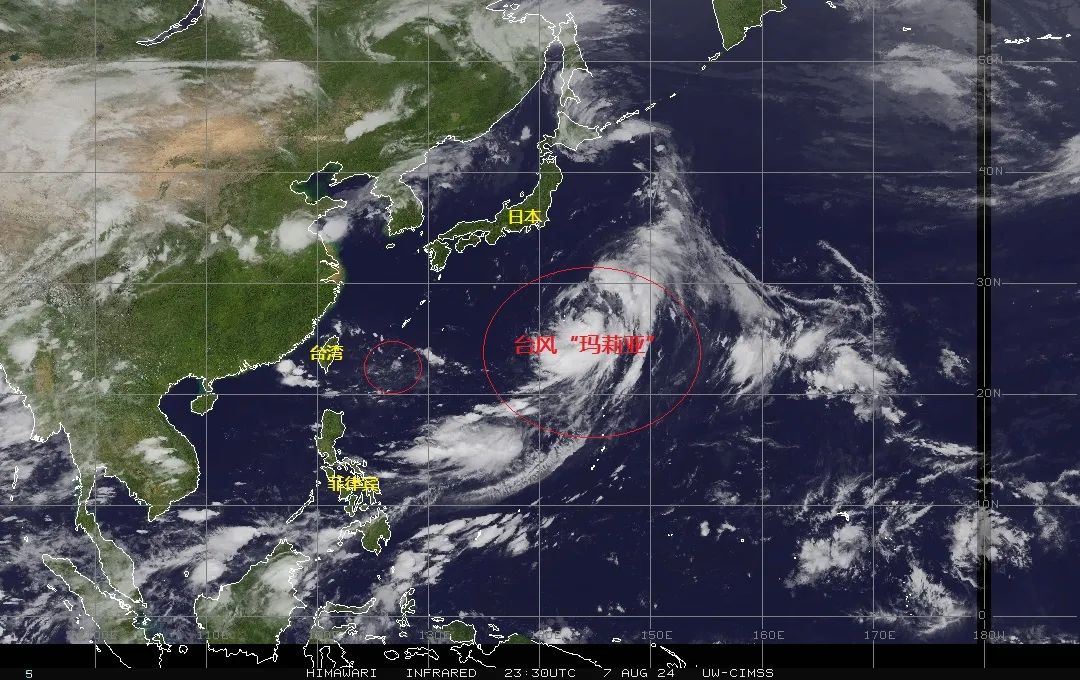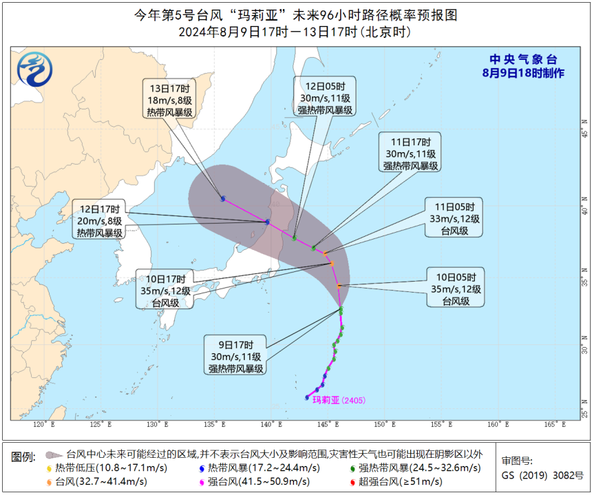 今年第5號臺風“瑪莉亞”的中心8月9日上午11時位于距離日本東京東南方向約780公里,中心附近最大風力11級(30米/秒),中心最低氣壓975百帕。