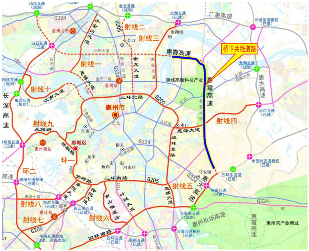 根據(jù)公告顯示,一號公路(惠霞高速東江灣產(chǎn)業(yè)園段)將建11.35公里長的橋下共線道路,與1號公路(惠霞高速)AK13~AK24段形成復(fù)合廊道。