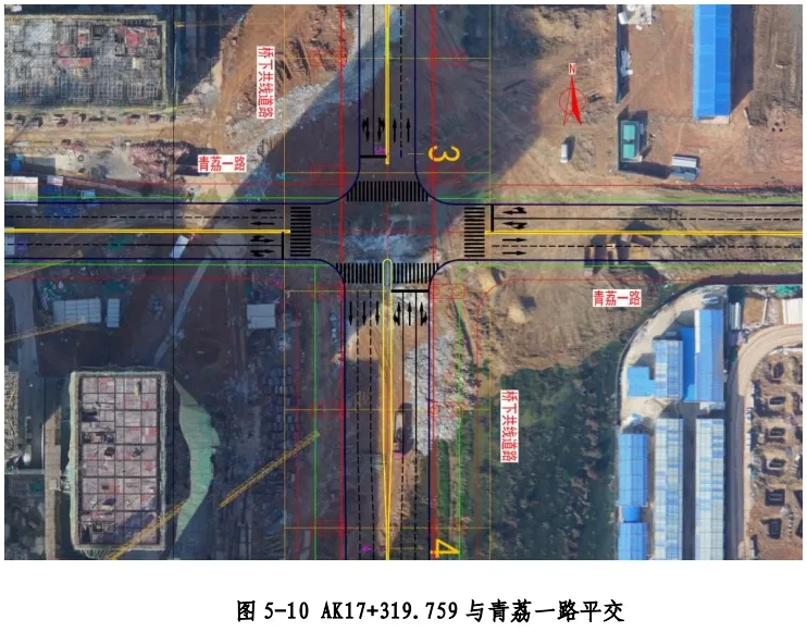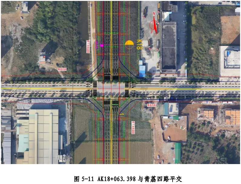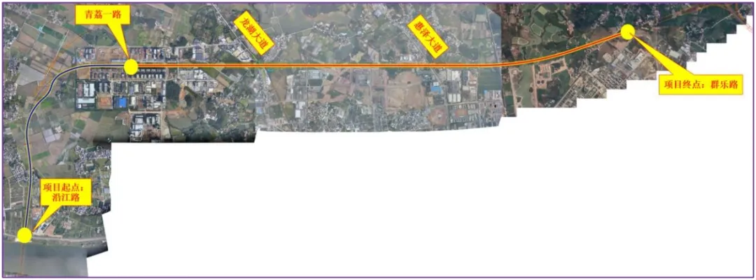 項(xiàng)目全長11.35千米,道路等級為城市主干路,紅線寬度60米,分為兩期實(shí)施,其中一期為青荔一路至群樂路路段,道路長7.63千米、寬45.5米,為雙向六車道;二期為沿江路至青荔一路路段,道路長3.72千米、寬14.5米,為雙向四車道。